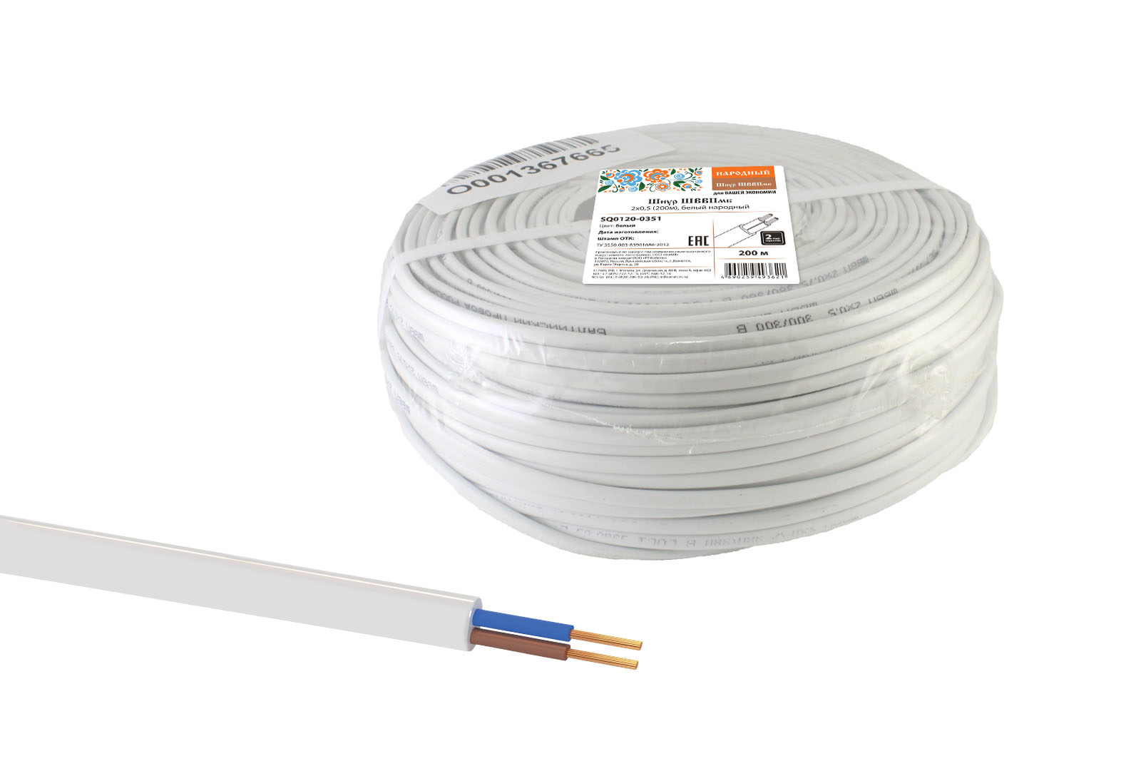 Наименование: Шнур ШВВПмб 2х0,5 (200м), белый Народный