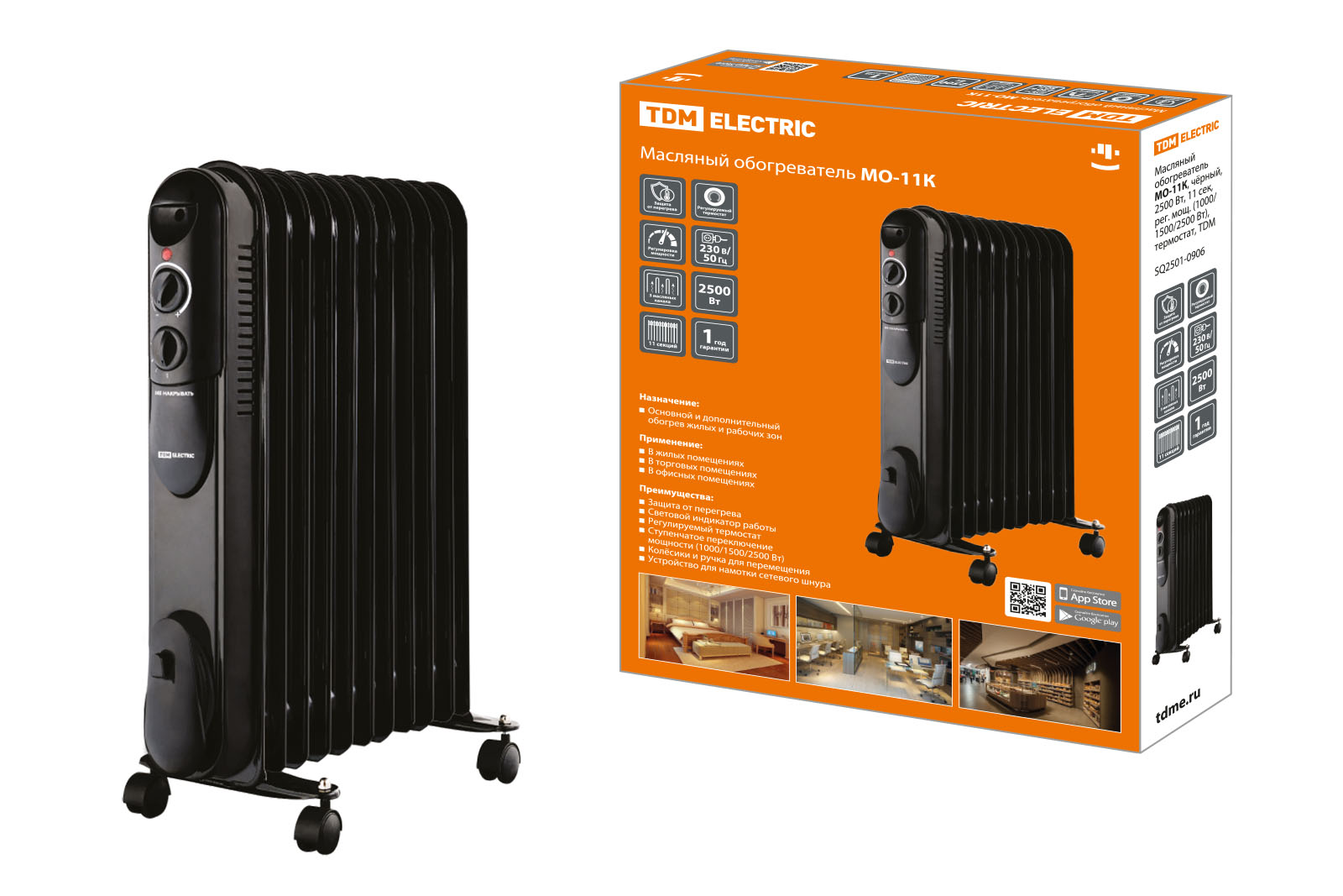 Наименование: Масляный обогреватель МО-11К, чёрный, 2500 Вт, 11 сек, рег. мощ. (1000/1500/2500 Вт), термостат, TDM