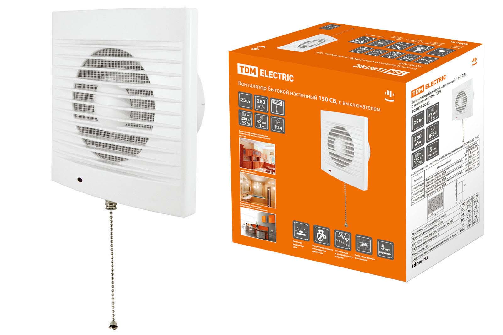 Наименование: Вентилятор бытовой настенный 150 СВ, с выключателем, TDM