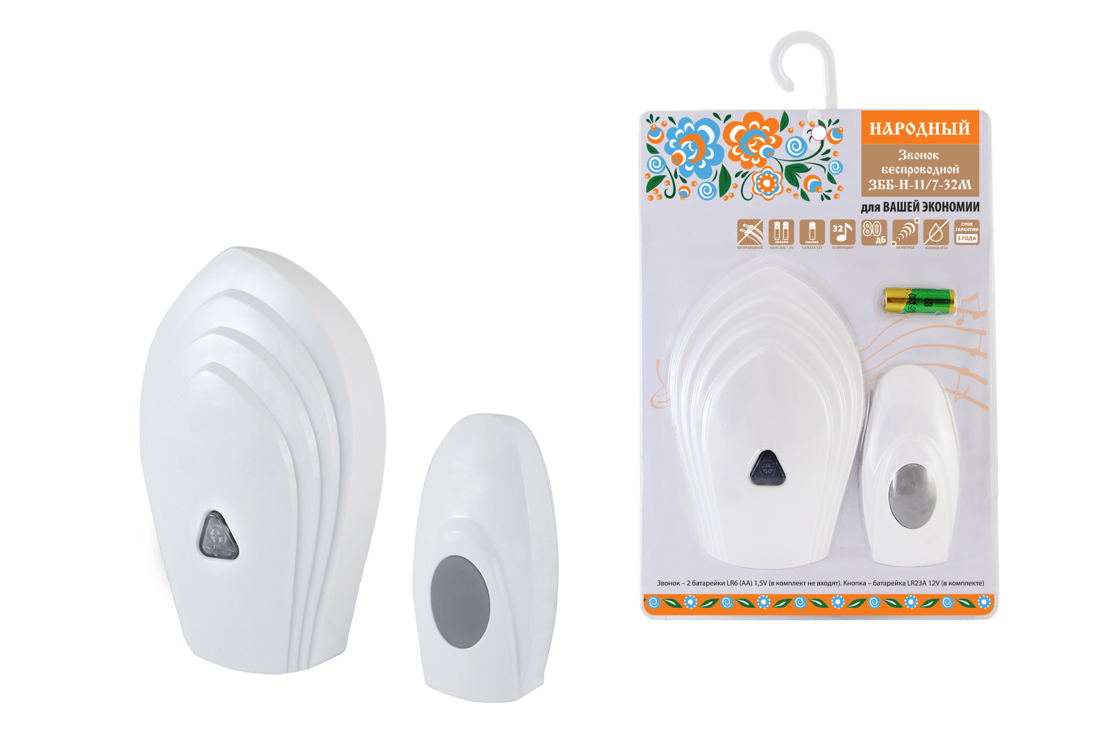 Звонок народный ЗББ-Н-11/7-32М (беспр., бат., блистер, откр.код)