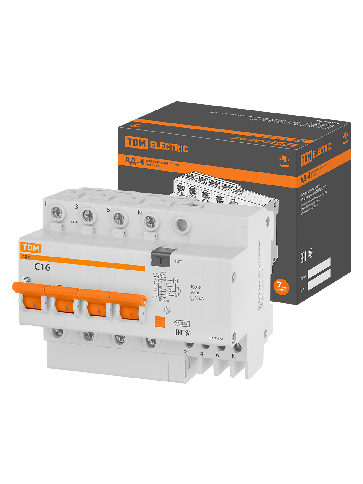 Наименование: Диф.автомат АД-4 4Р, C16, 30мА, 4,5кА, тип АС, TDM