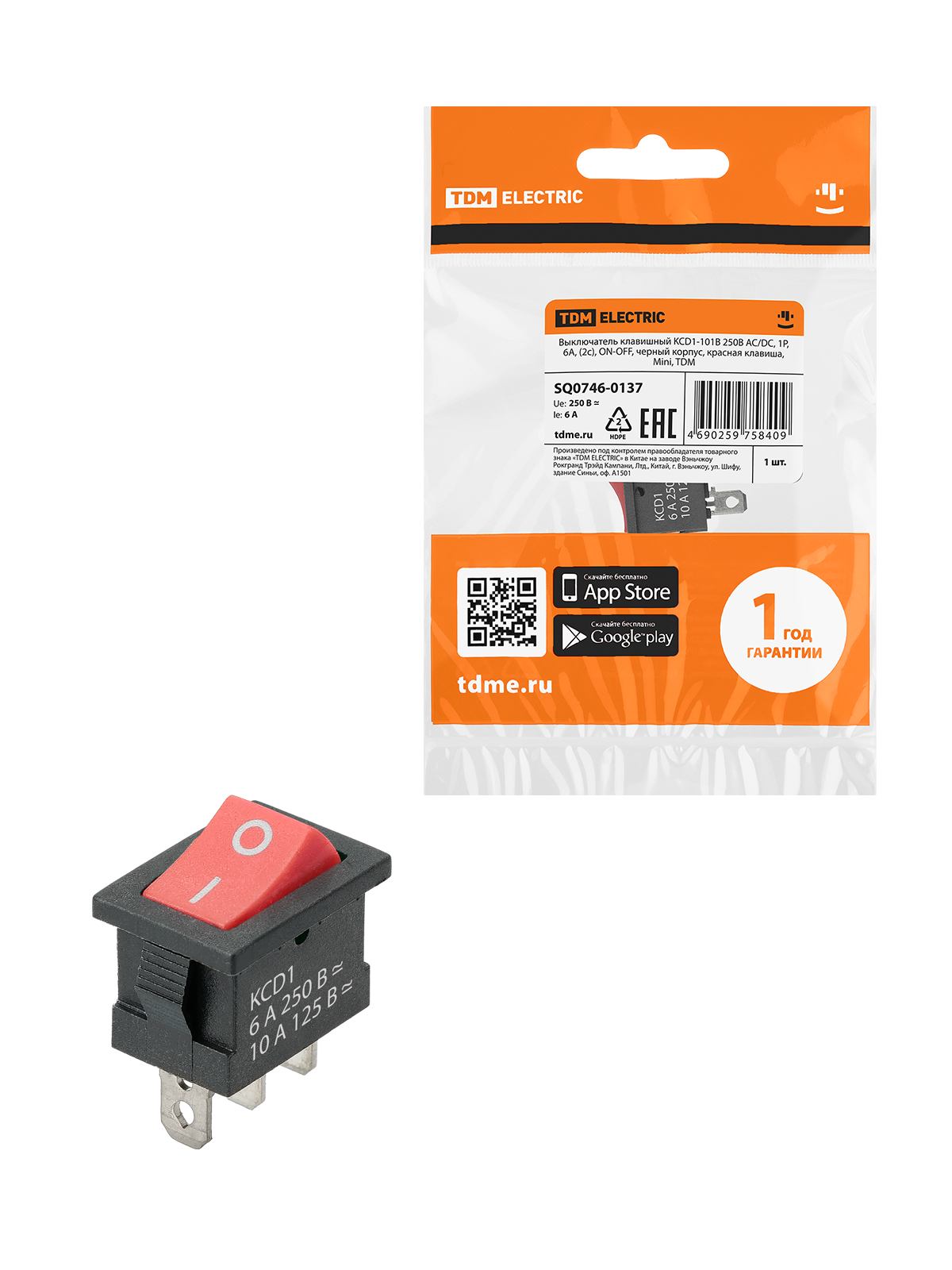 Наименование: KCD1-102 250В AC/DC, 1P, 6А, (3с), ON-ON, черный корпус, красная клавиша, Mini TDM