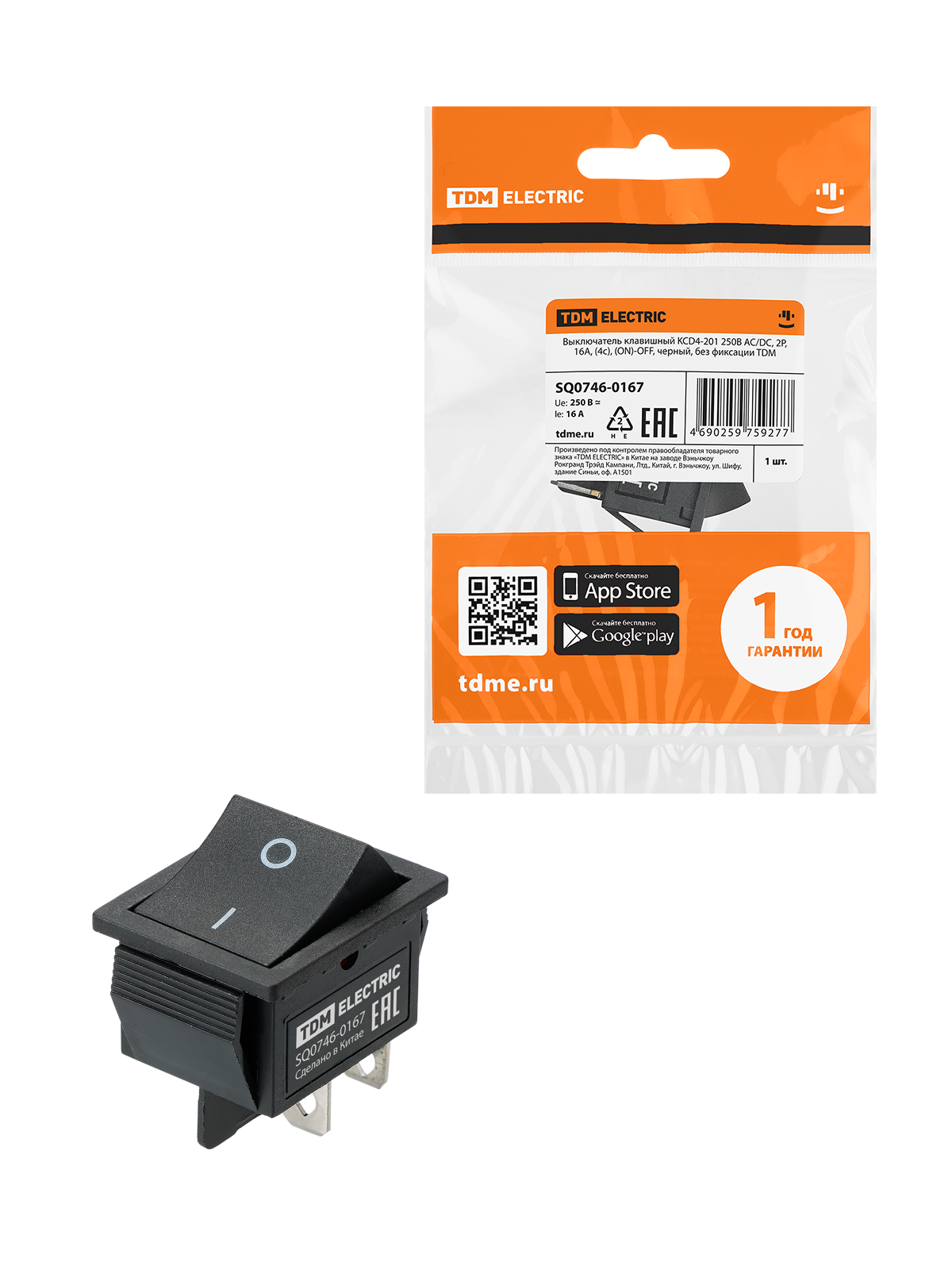 Наименование: KCD4-201 250В AC/DC, 2P, 16А, (4с), (ON)-OFF, черный, без фиксации TDM