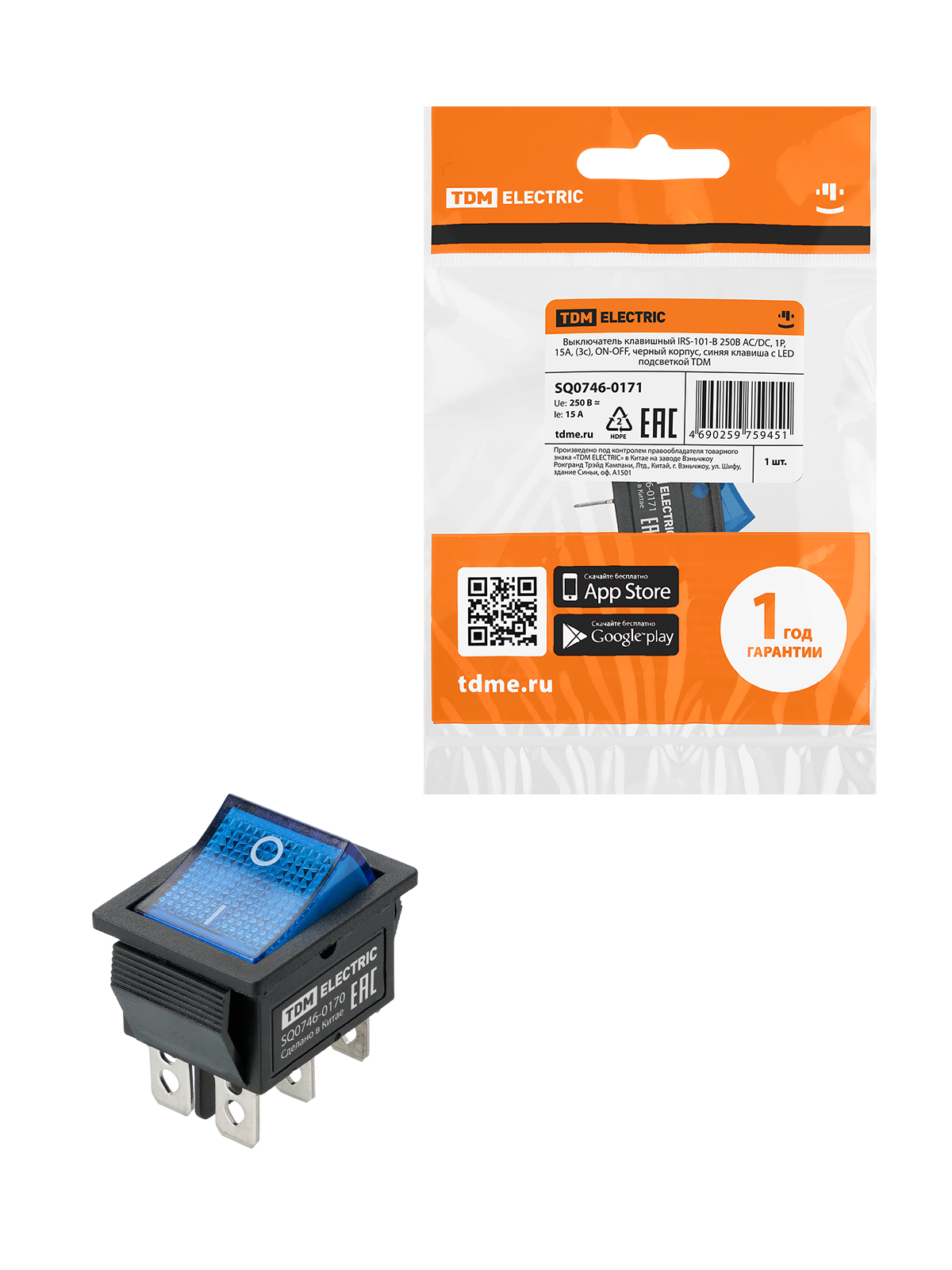 Наименование: KCD4-202N 250В AC/DC, 2P, 15А, (6с), ON-ON, черный корпус, синяя клавиша, LED TDM