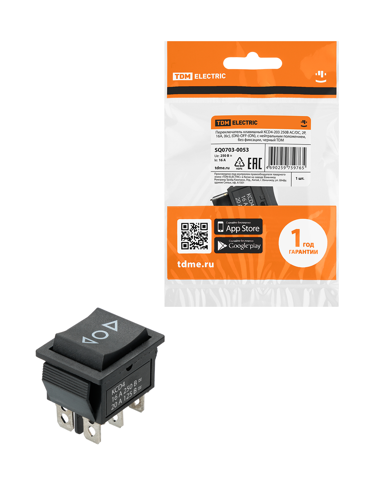 Наименование: KCD4-203 250В AC/DC, 2P, 16А, (6с), (ON)-OFF-(ON) с нейтралью, без фиксации, черный TDM