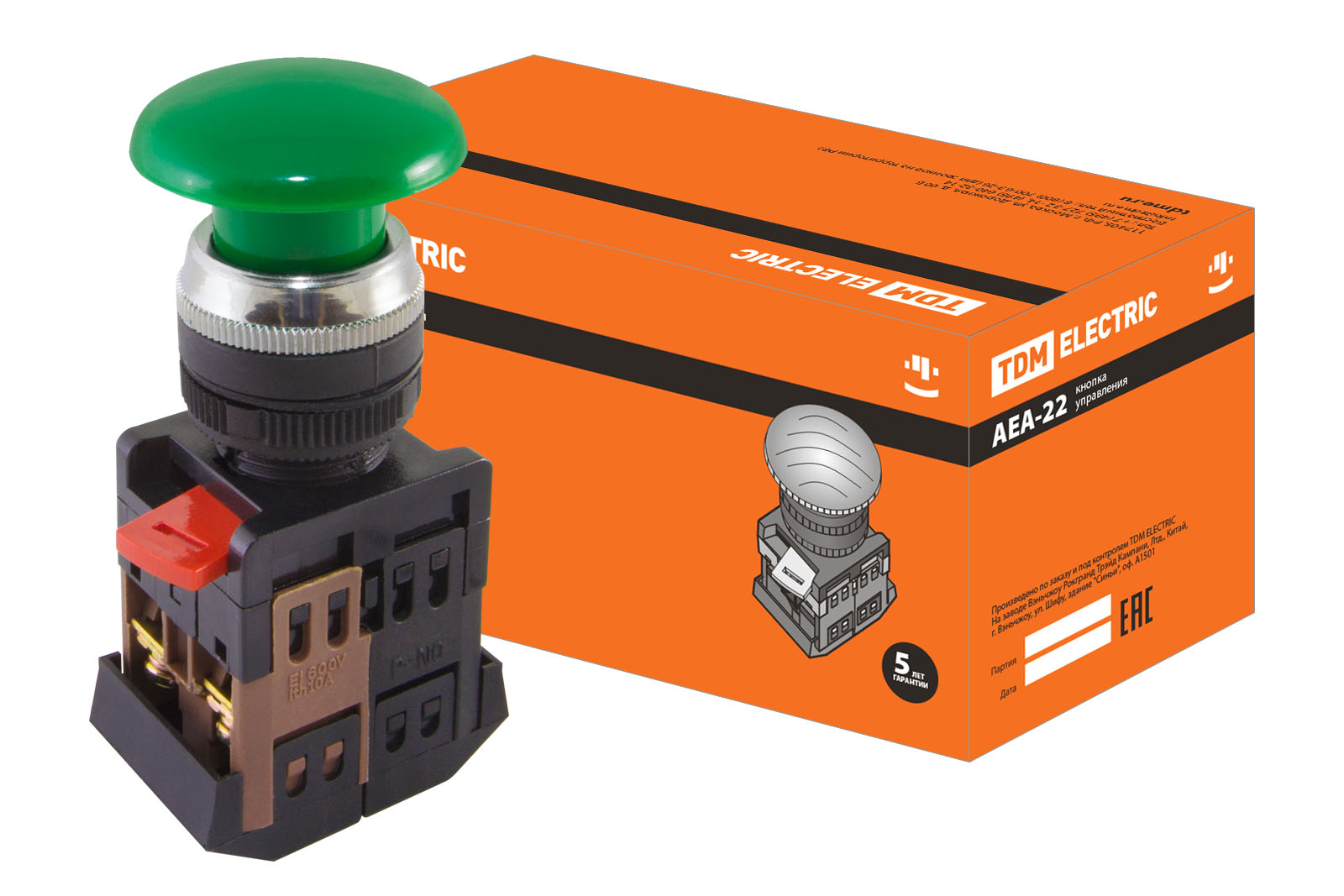 Наименование: Кнопка AEА-22 "Грибок" зеленый d22мм 1з+1р TDM