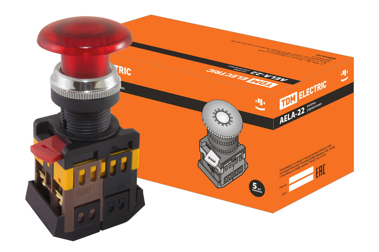 Наименование: Кнопка AELA-22 "Грибок" красный d22мм неон/230В 1з+1р TDM