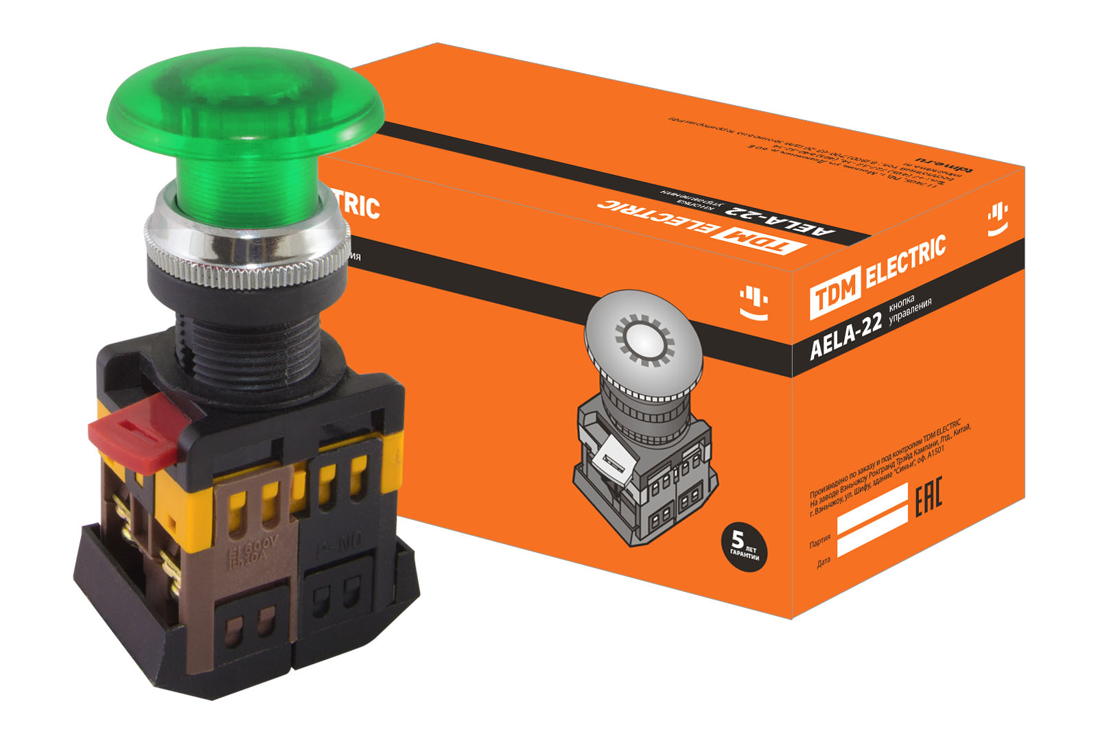 Наименование: Кнопка AELA-22 "Грибок" зеленый d22мм неон/230В 1з+1р TDM