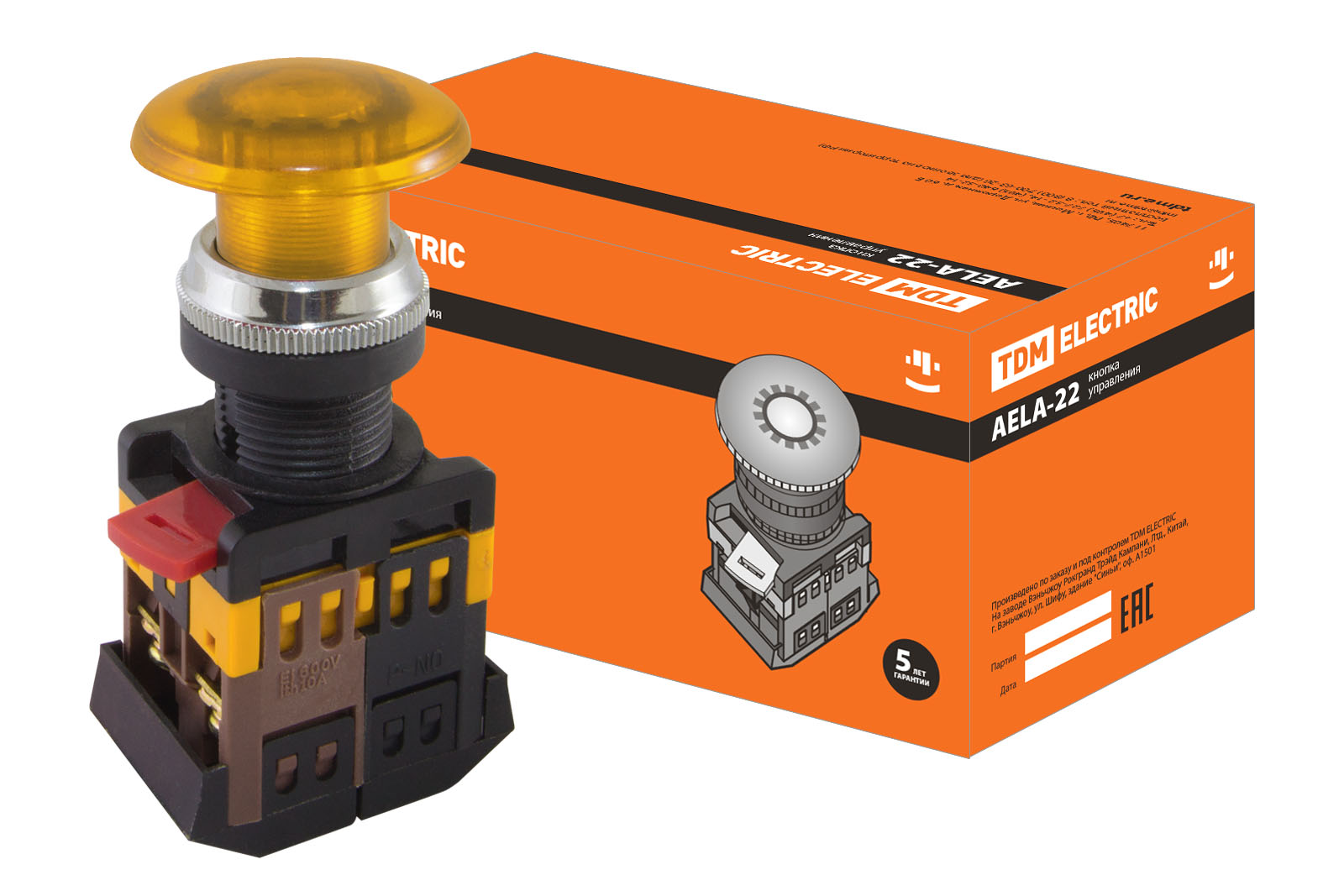 Наименование: Кнопка AELA-22 "Грибок" желтый d22мм неон/230В 1з+1р TDM