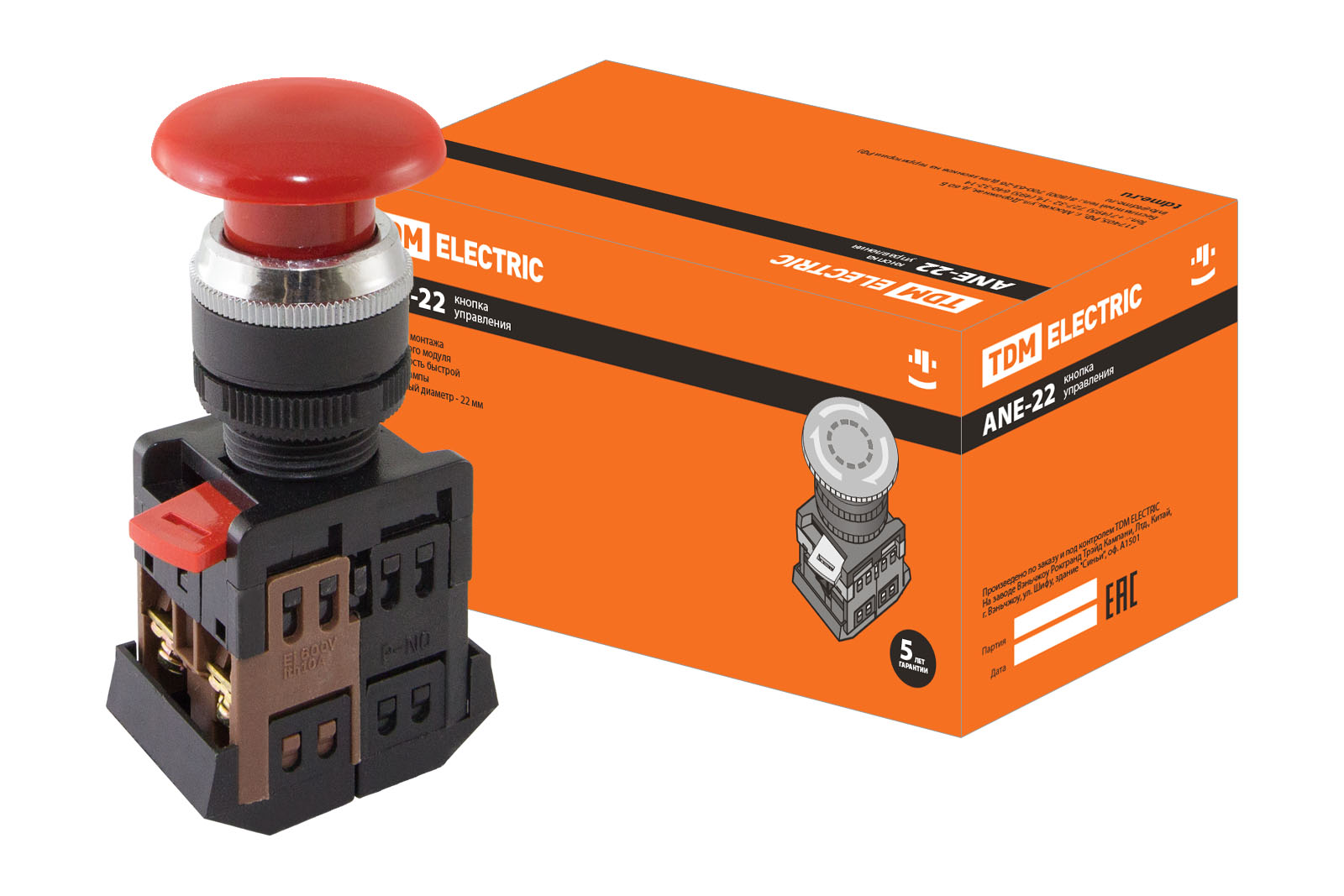 Наименование: Кнопка ANE-22 "Грибок"с фиксацией красный d22мм неон/230В 1з+1р TDM