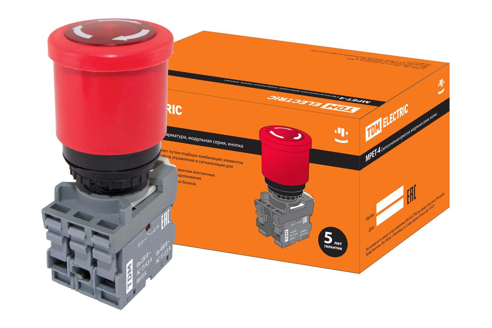 Наименование: Кнопка грибовидная, возврат поворотом MPET4-10R в сборе d40мм 1з+1р красная TDM