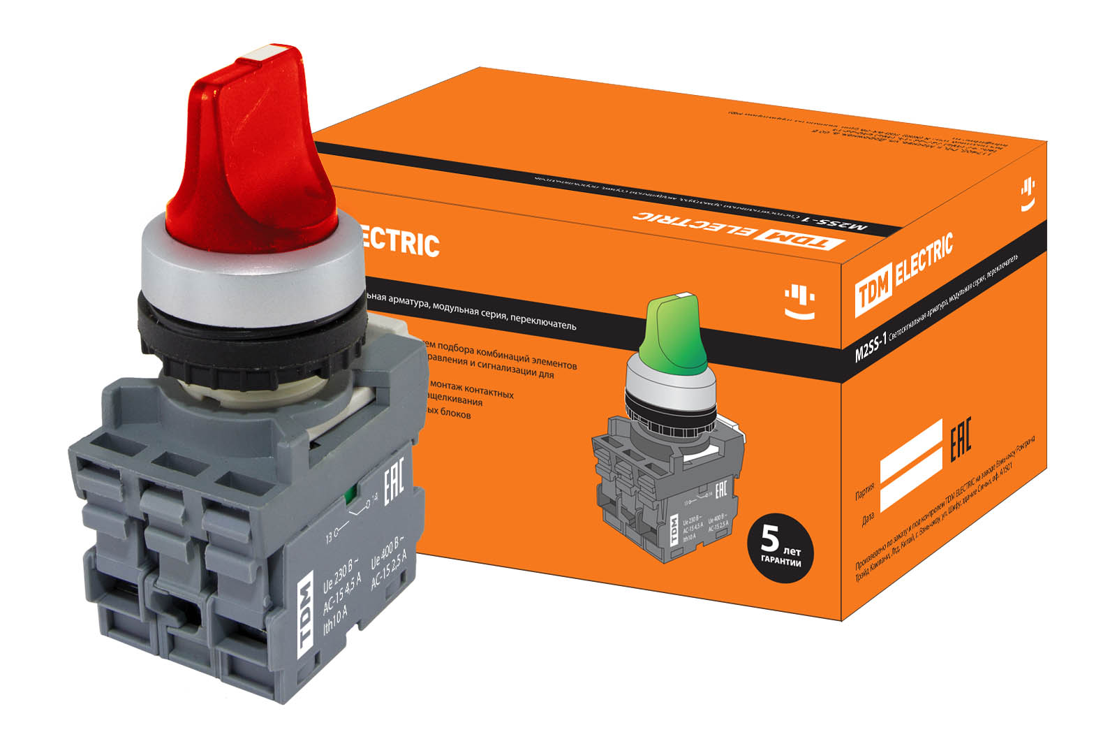 Наименование: Переключатель на 2 положения с фиксацией M2SS1-21R короткая ручка(LED) d22мм/220B 1з+1р красный TDM