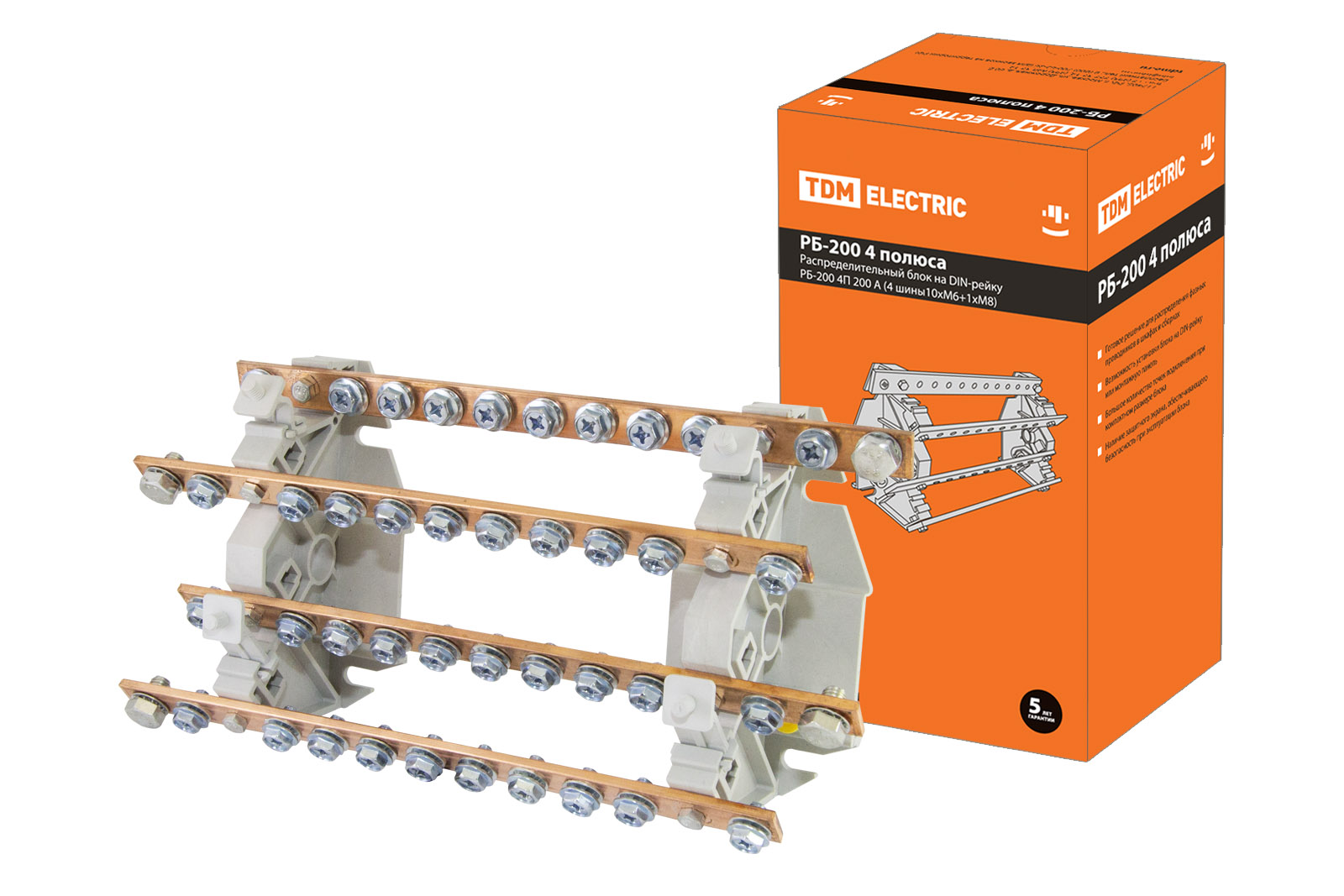 Наименование: Распределительный блок на DIN-рейку РБ-200 4П 200А (4 шины 10xM6+1хM8) TDM