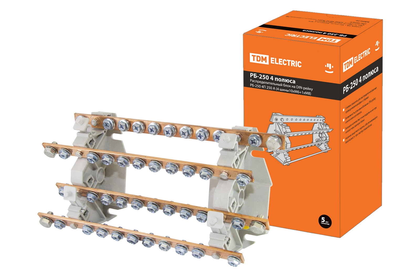 Наименование: Распределительный блок на DIN-рейку РБ-250 4П 250А (4 шины 10xM6+1хM8) TDM