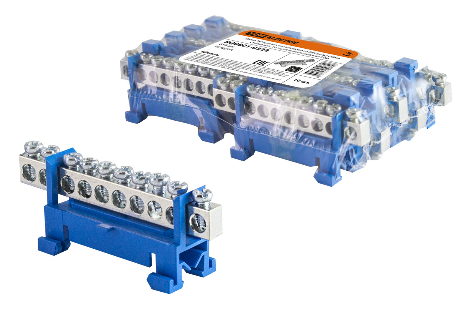 Наименование: Шина "N" нулевая с изолятором на DIN-рейку 6x9мм стойка мал. 10 групп никелированная TDM
