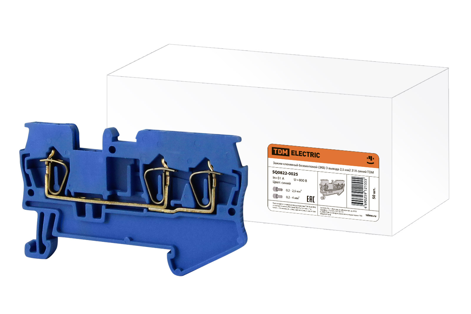 Наименование: Зажим клеммный безвинтовой (ЗКБ) 3 вывода 2,5 мм2 31А синий TDM