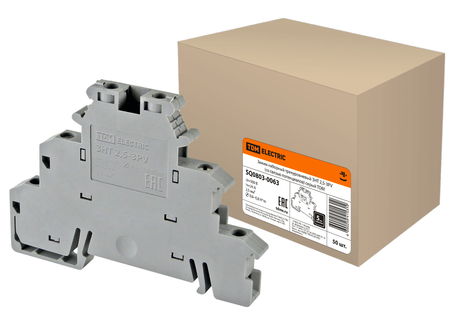 Наименование: Зажим наборный трехуровневый ЗНТ 2,5-3PV (со связью потенциалов) серый TDM