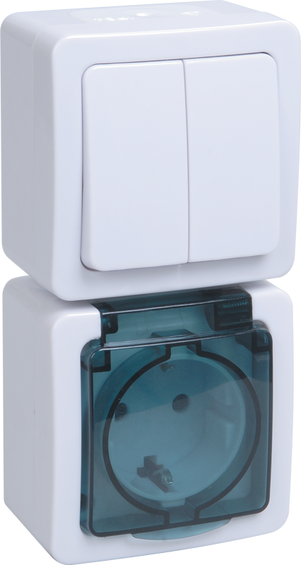 Наименование: Блок вертикальный для открытой установки БВб-22-32-ГПБд (Выключатель 2-клавишный + розетка 1-местная с заземляющим контактом) IP54 ГЕРМЕС PLUS (белый/дымчатый) IEK