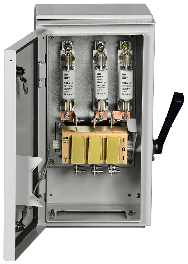 Описание: Предназначены для нечастых коммутаций и защиты от токов короткого замыкания в цепях трехфазного переменного тока напряжением 400/230 В частотой 50 Гц. Внутри корпуса установлены выключатель-разъединитель ВР-32И, три держателя предохранителей ДП-33 с предохранителем ППНИ-33. Ввод и вывод кабелей предусматривается сверху и снизу. Ручка управления выключателя - разъединителя ВР-32И выведена наружу.