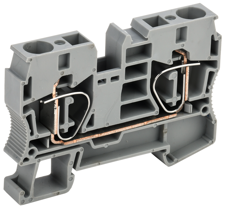 Преимущества: Корпус выполнен из негорючего полиамида PA6.6. Возможность использования двойного ряда перемычек. Маркировка с возможностью использования символов. Маркировка для обозначения рядов клеммных сборок. Пружинный зажим с автоматической регулировкой усилия прижима. Токоведущая пластина выполнена из меди с гальваническим покрытием. Широкий размерный ряд и различные цвета исполнения клемм.