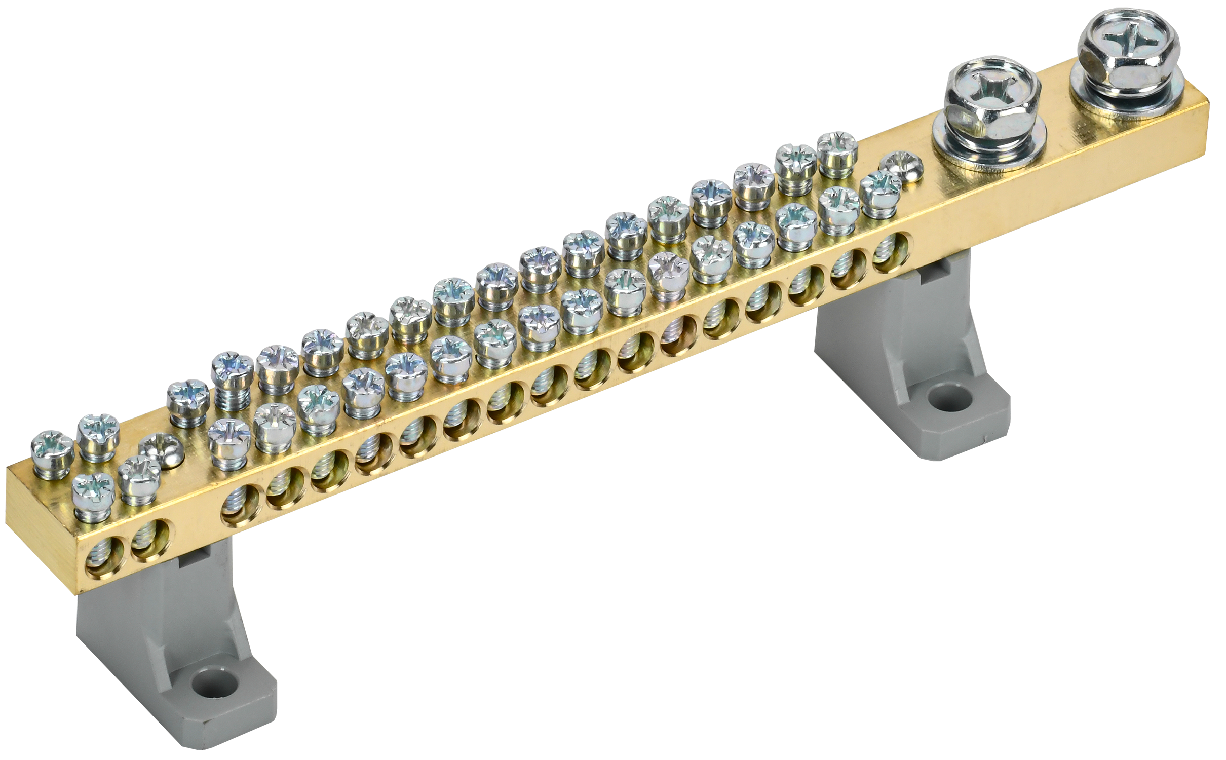 Описание: Шины типа ШНИ применяются при комплектации щитового оборудования и предназначены для электрического и механического соединения нулевых (N), защитных (PE) и фазных проводников. Крепление шины предусмотрено по центру (типы 8/1; 14/1) и по краям (типы 8/2 и 14/2) через изолятор нулевой шины на 35-мм монтажную DIN-рейку или через угловые изоляторы нулевой шины, а также непосредственно на панель щита. При подключении к шинам медных многожильных проводов рекомендуется оконцевание их наконечниками-гильзами. Конструктивно шины ШНИ и кросс-модули выполнены из латунной шины, установленной на пластиковый изолятор или в изолятор, изготовленный из самозатухающего пластика.