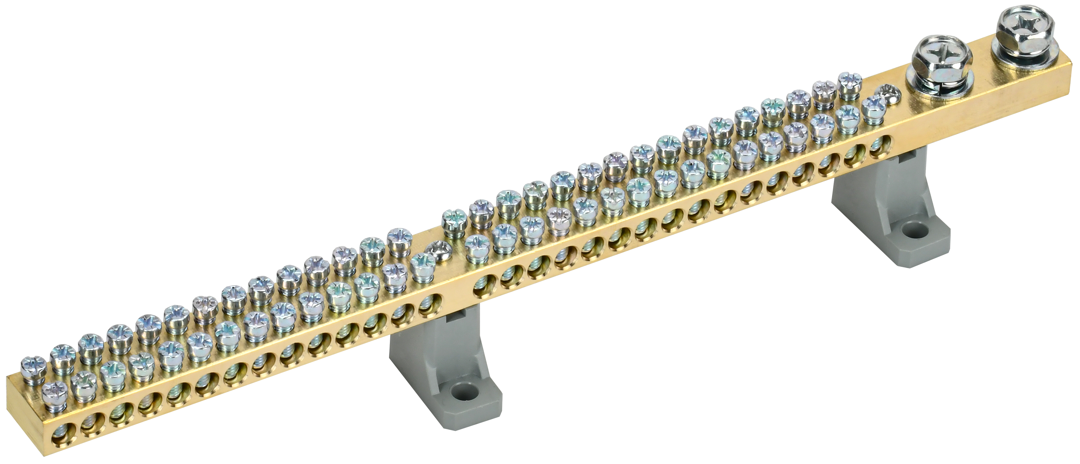 Описание: Шины типа ШНИ применяются при комплектации щитового оборудования и предназначены для электрического и механического соединения нулевых (N), защитных (PE) и фазных проводников. Крепление шины предусмотрено по центру (типы 8/1; 14/1) и по краям (типы 8/2 и 14/2) через изолятор нулевой шины на 35-мм монтажную DIN-рейку или через угловые изоляторы нулевой шины, а также непосредственно на панель щита. При подключении к шинам медных многожильных проводов рекомендуется оконцевание их наконечниками-гильзами. Конструктивно шины ШНИ и кросс-модули выполнены из латунной шины, установленной на пластиковый изолятор или в изолятор, изготовленный из самозатухающего пластика.