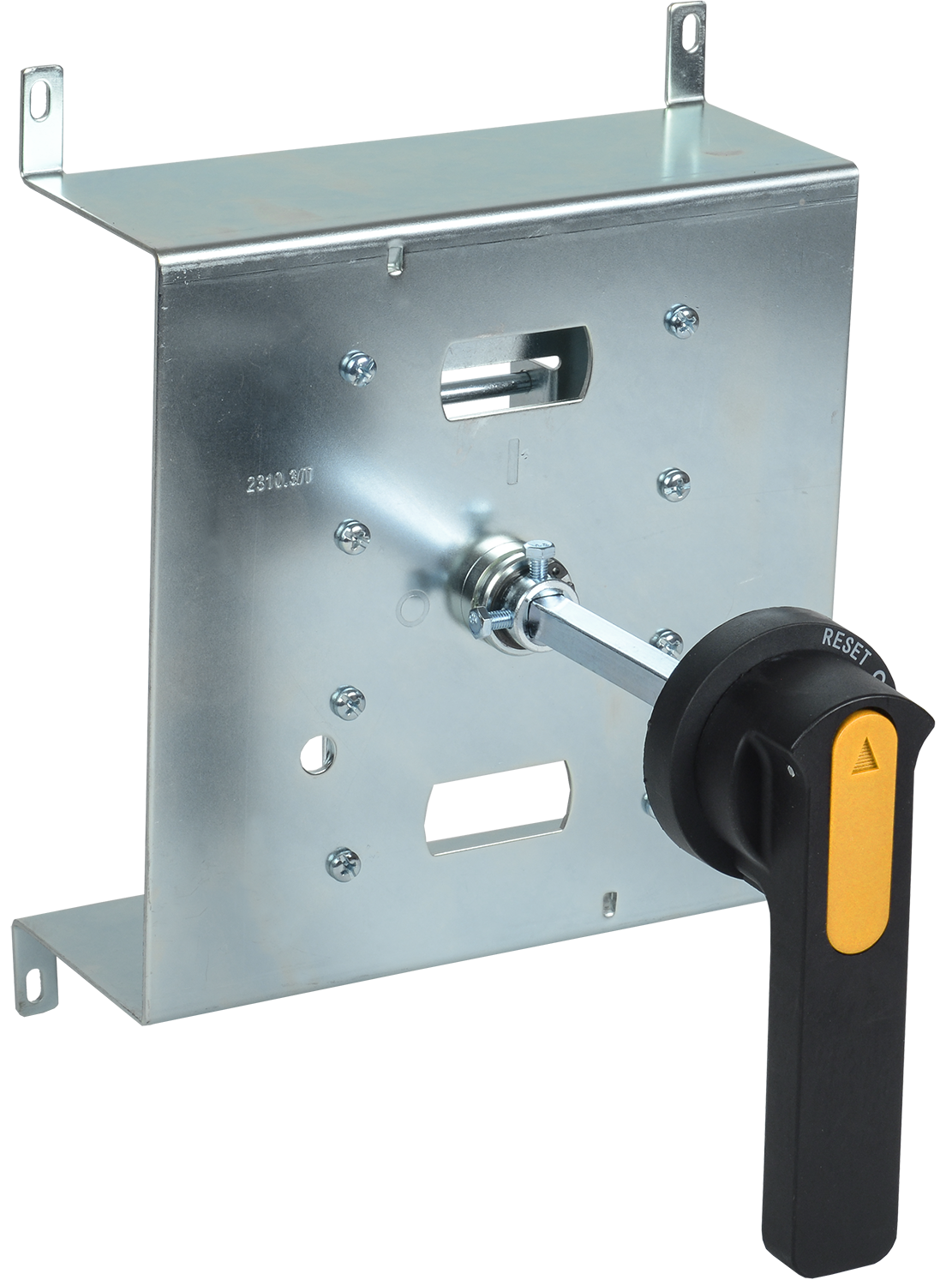 Описание: Ручной поворотный привод ПРПм предназначен для преобразования вращательного движения в поступательное для управления автоматическим выключателем ВА88 MASTER. Привод закрепляется на двери распределительного устройства для оперирования выключателем через дверь или непосредственно на выключателе.