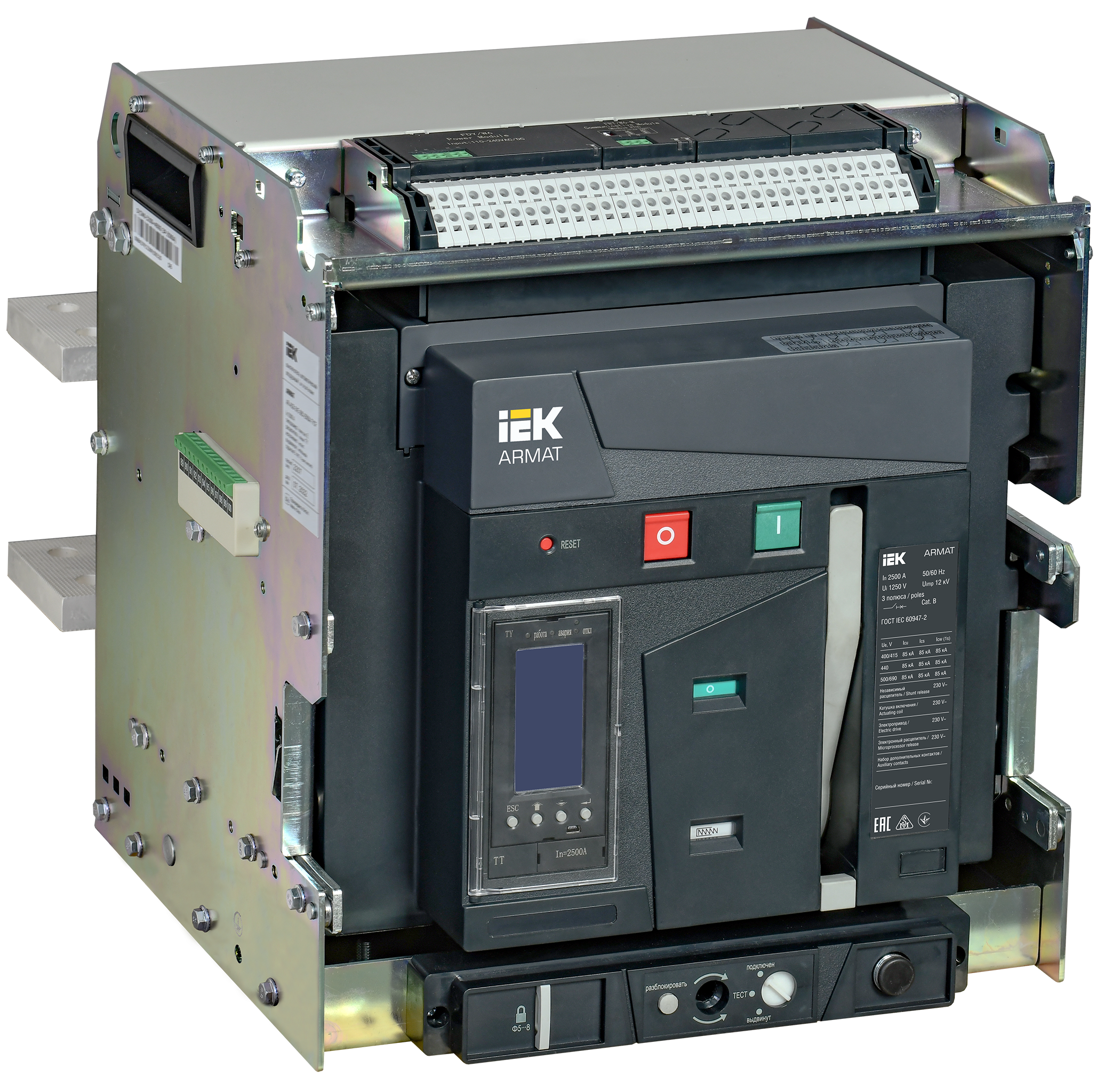 Наименование: ARMAT Воздушный автоматический выключатель выдвижного исполнения 3P типоразмер D 85кА 2500А расцепитель TT с комплектом аксессуаров 220В: мотор привод катушка включения катушка отключения IEK