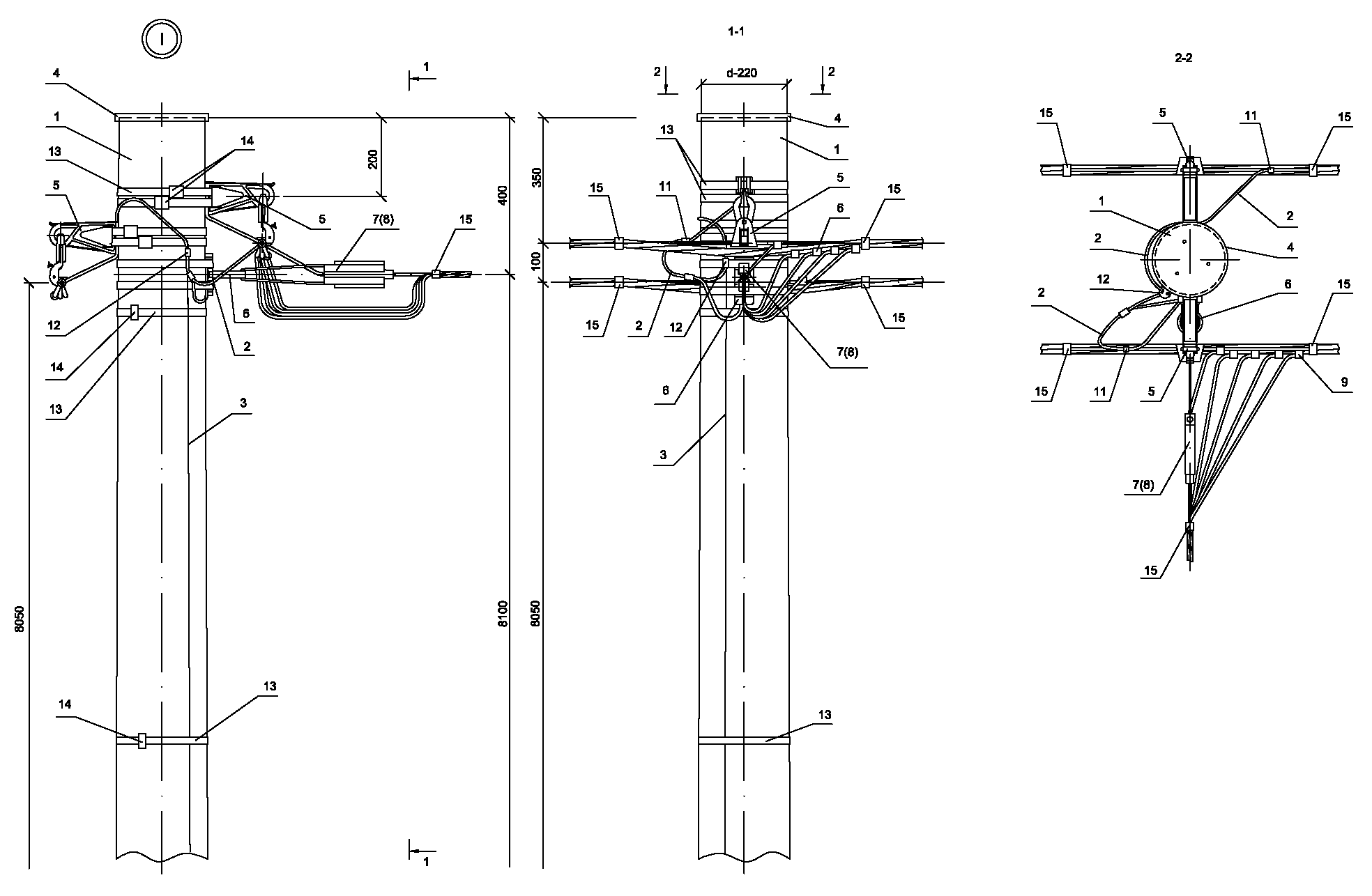 Описание: В составе проекта разработаны деревянные опоры ВЛИ 0,4кВ в соответствии с требованиями ПУЭ 7 издания. Опоры ВЛИ 0,4кВ разработаны на базе деревянных стоек длиной 9,5м, 11м, 12м. Одно и двухцепные опоры могут применяться в I-IV районах по ветру и гололёду. На всех типах опор предусмотрена возможность ответвления к вводам в здания в одну и в две стороны от ВЛ двух, четырех и 2х2 жил СИП. Опора ППОд161 устанавливается в случаях, когда требуется выполнять повторные заземления и заземления для защиты от атмосферных перенапряжений.