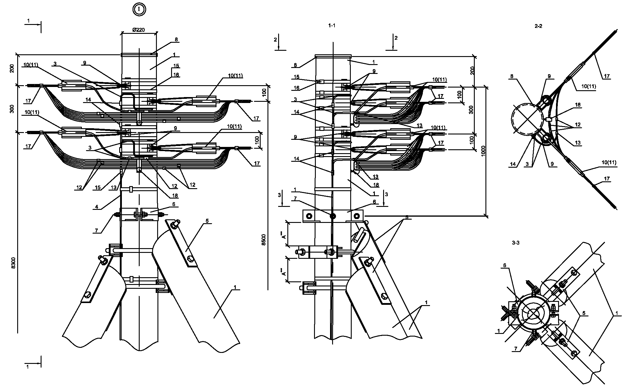 Описание: В составе проекта разработаны деревянные опоры ВЛИ 0,4кВ в соответствии с требованиями ПУЭ 7 издания. Опоры ВЛИ 0,4кВ разработаны на базе деревянных стоек длиной 9,5м, 11м, 12м. Одно и двухцепные опоры могут применяться в I-IV районах по ветру и гололёду. На всех типах опор предусмотрена возможность ответвления к вводам в здания в одну и в две стороны от ВЛ двух, четырех и 2х2 жил СИП. Опора ПУАд161 устанавливается в случаях, когда требуется выполнять повторные заземления и заземления для защиты от атмосферных перенапряжений. Максимально допустимый угол поворота ВЛИ 90 градусов.