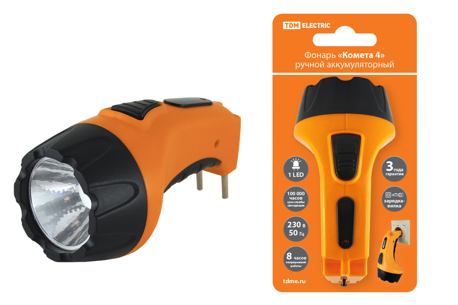 Наименование: Фонарь «Комета 4» ручной аккумуляторный, 1Вт 1 светодиод, 0,5Ач 230В вилка, TDM
