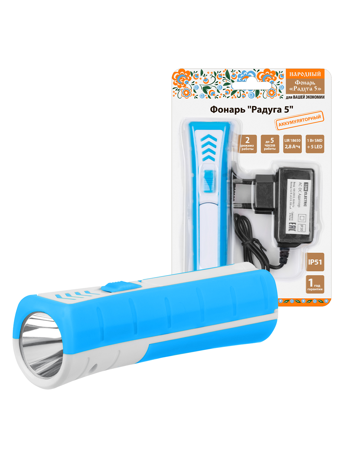 Фонарь "Радуга 5" аккум., 1 Вт SMD + 5 SMD, 28 лм, Li-Ion 2,8 А*ч, 230 В, голубой, Народная