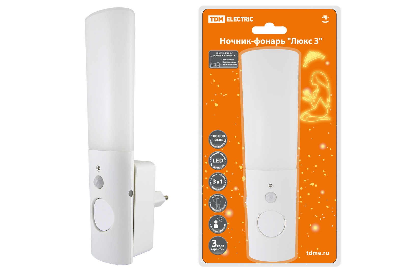 Наименование: Ночник-фонарь "Люкс 3", 1х0,5 Вт + 2LED, 70 лм/Вт, Li-Ion 250 мАч, дат. освещ. и движ., 220 В, TDM