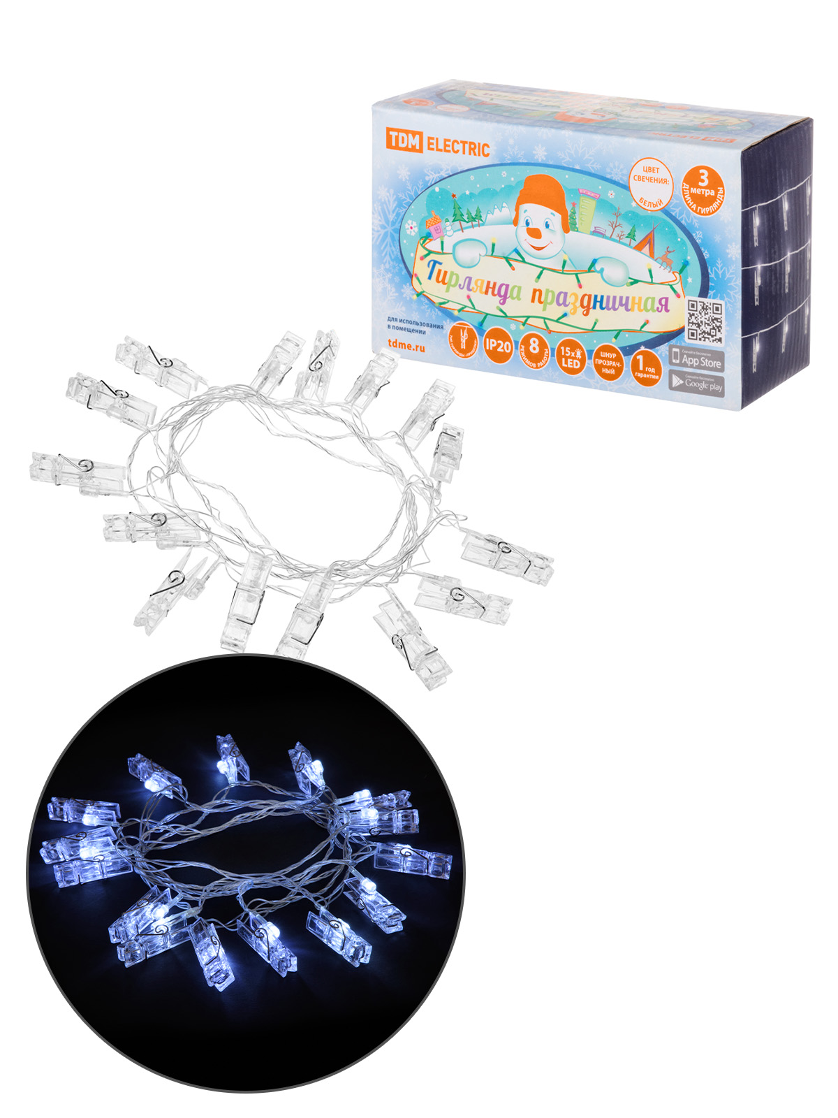 Наименование: Гирлянда светодиодная "Прищепки" 3 м, 15LED, белый, 8 режимов, 250 В, IP20, TDM