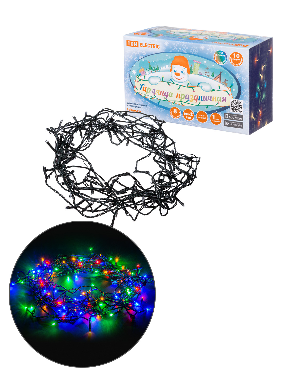 Гирлянда светодиодная СГ100MЗ10, многоцвет., зеленый шнур, 10м, 8 режимов, 250 В, TDM