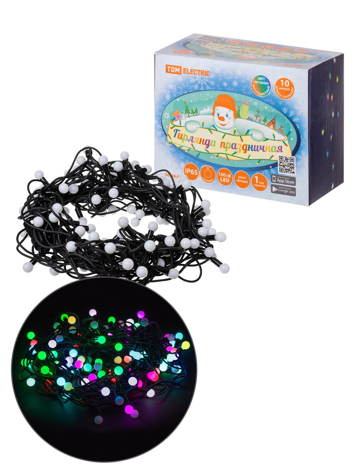 Наименование: Гирлянда светодиодная "Шарики" 100LED, 10м, многоцвет., каучук чер., посл.подключ., 250 В, IP65, TDM