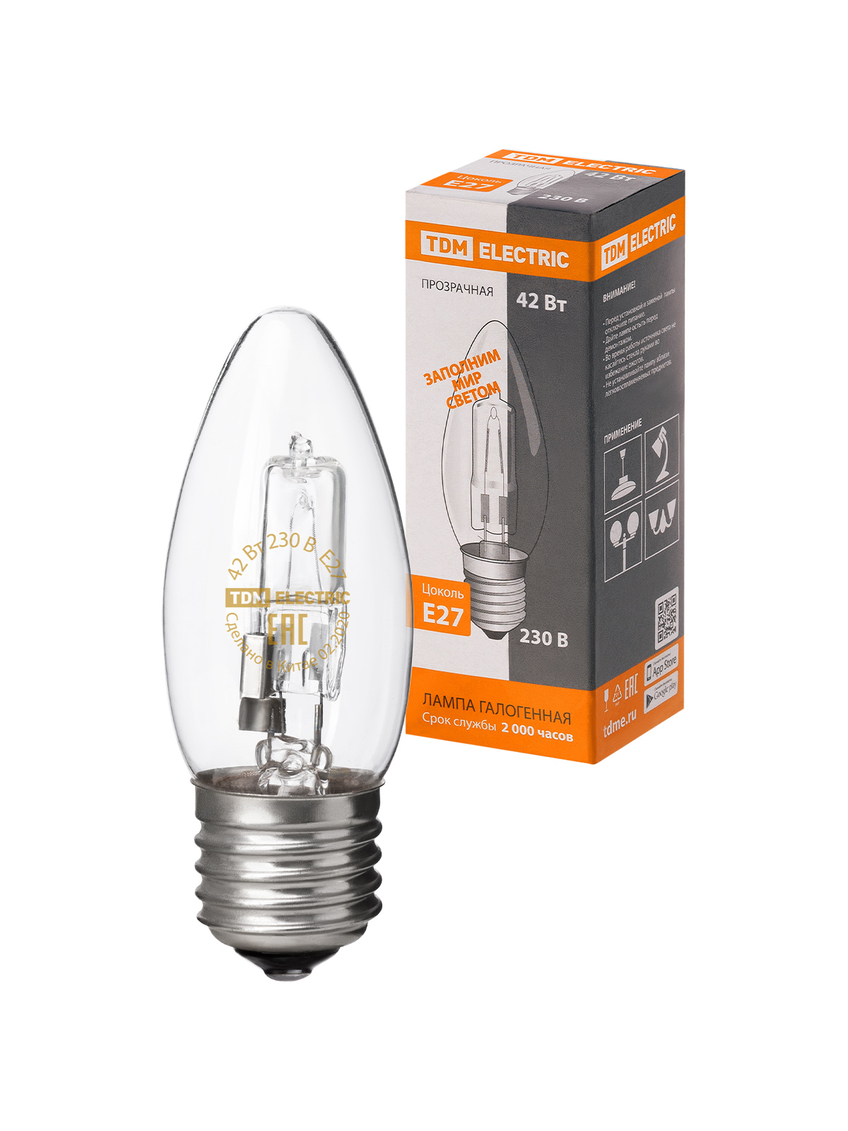 Наименование: Лампа галогенная "Свеча" прозрачная 42 Вт-230 В-Е27 TDM