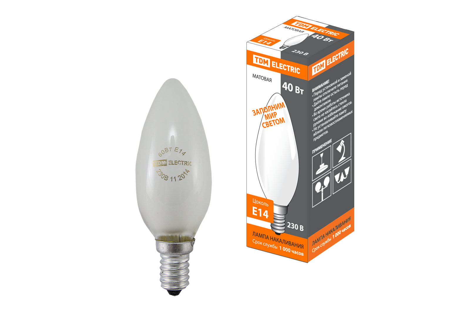 Наименование: Лампа накаливания "Свеча матовая" 40 Вт-230 В-Е14 TDM