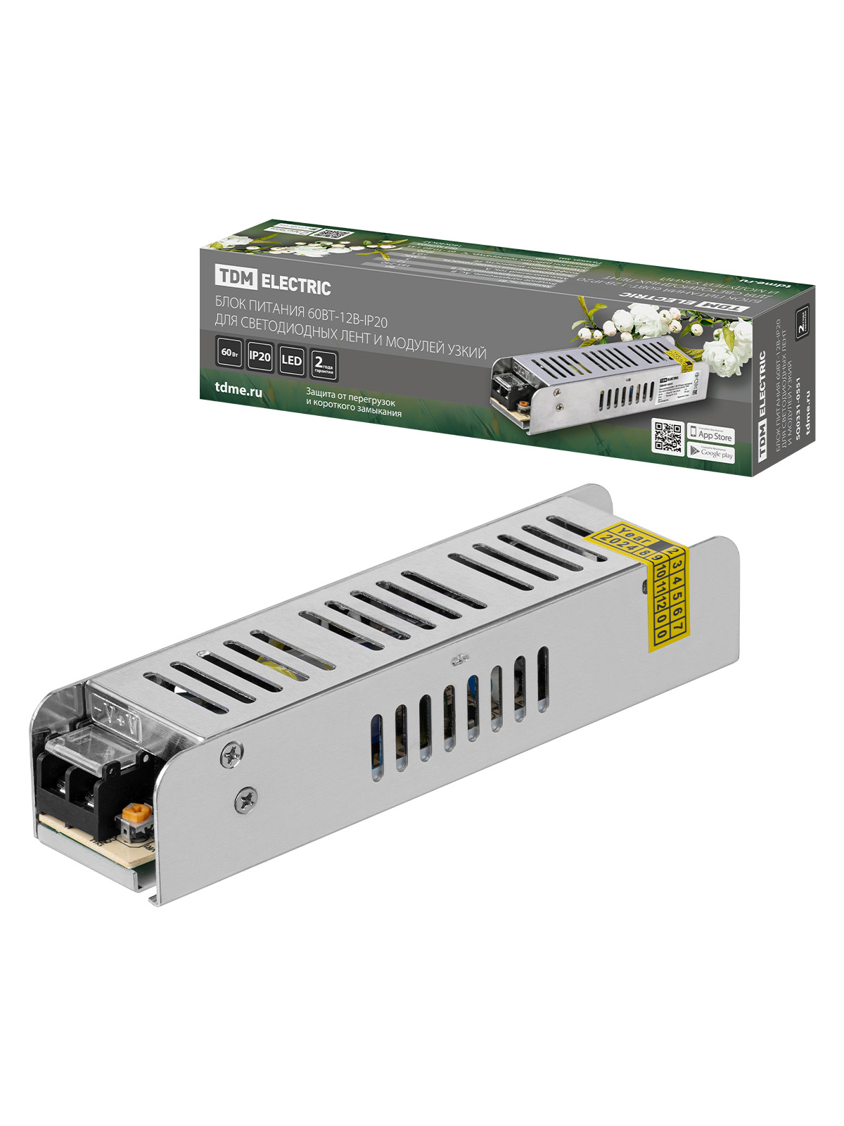 Наименование: Блок питания 60Вт-12В-IP20 для светодиодных лент и модулей, металл, узкий, TDM