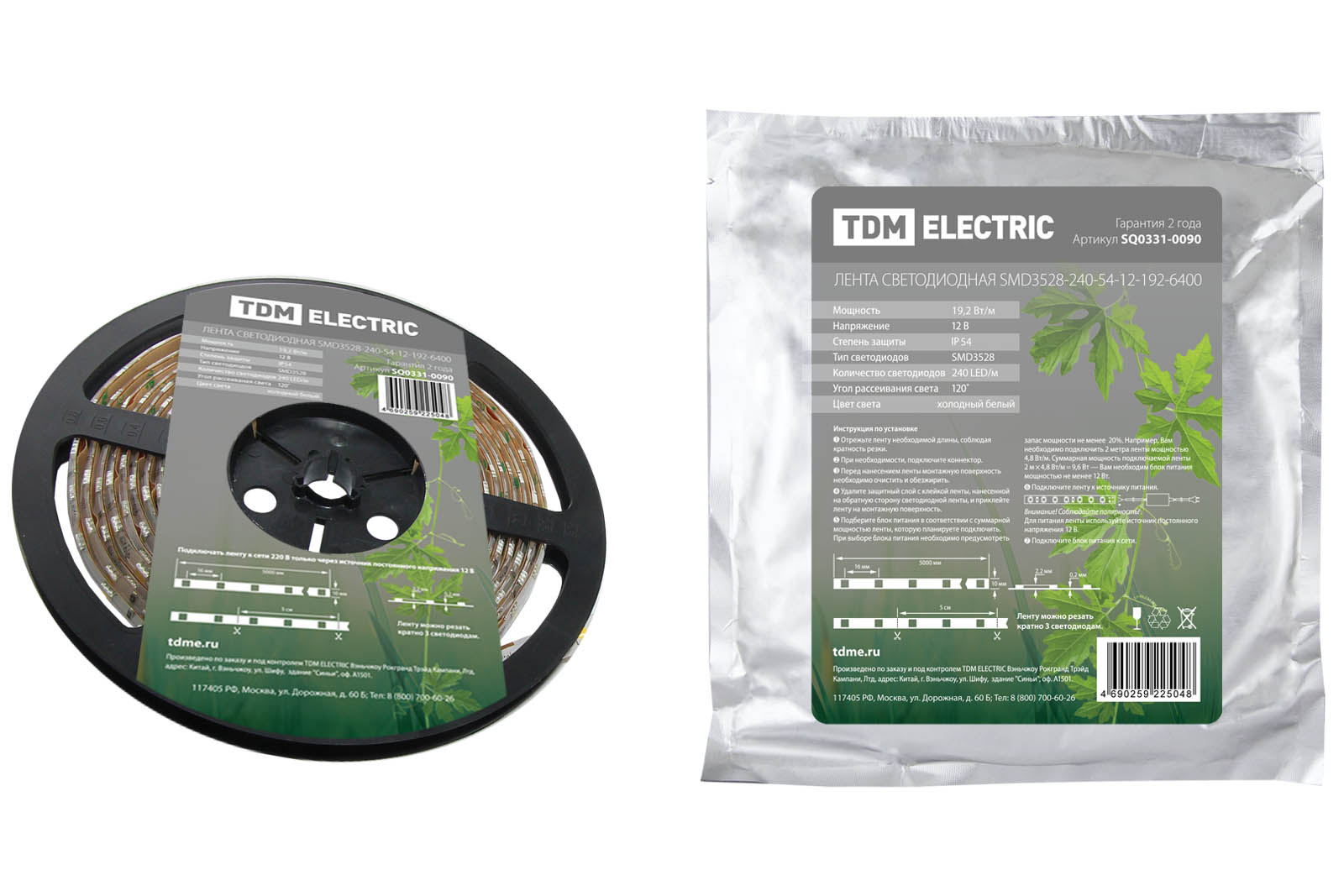 Наименование: Лента светодиодная SMD3528-240-54-12-192-6400 240LED/м, IP54, 12В, 19,2Вт, 6400К, TDM