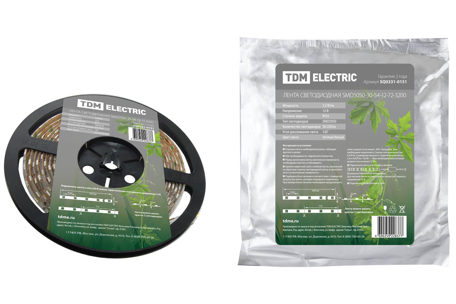 Наименование: Лента светодиодная SMD5050-30-54-12-72-3200 30LED/м, IP54, 12В, 7.2Вт, 3200К, (У) TDM