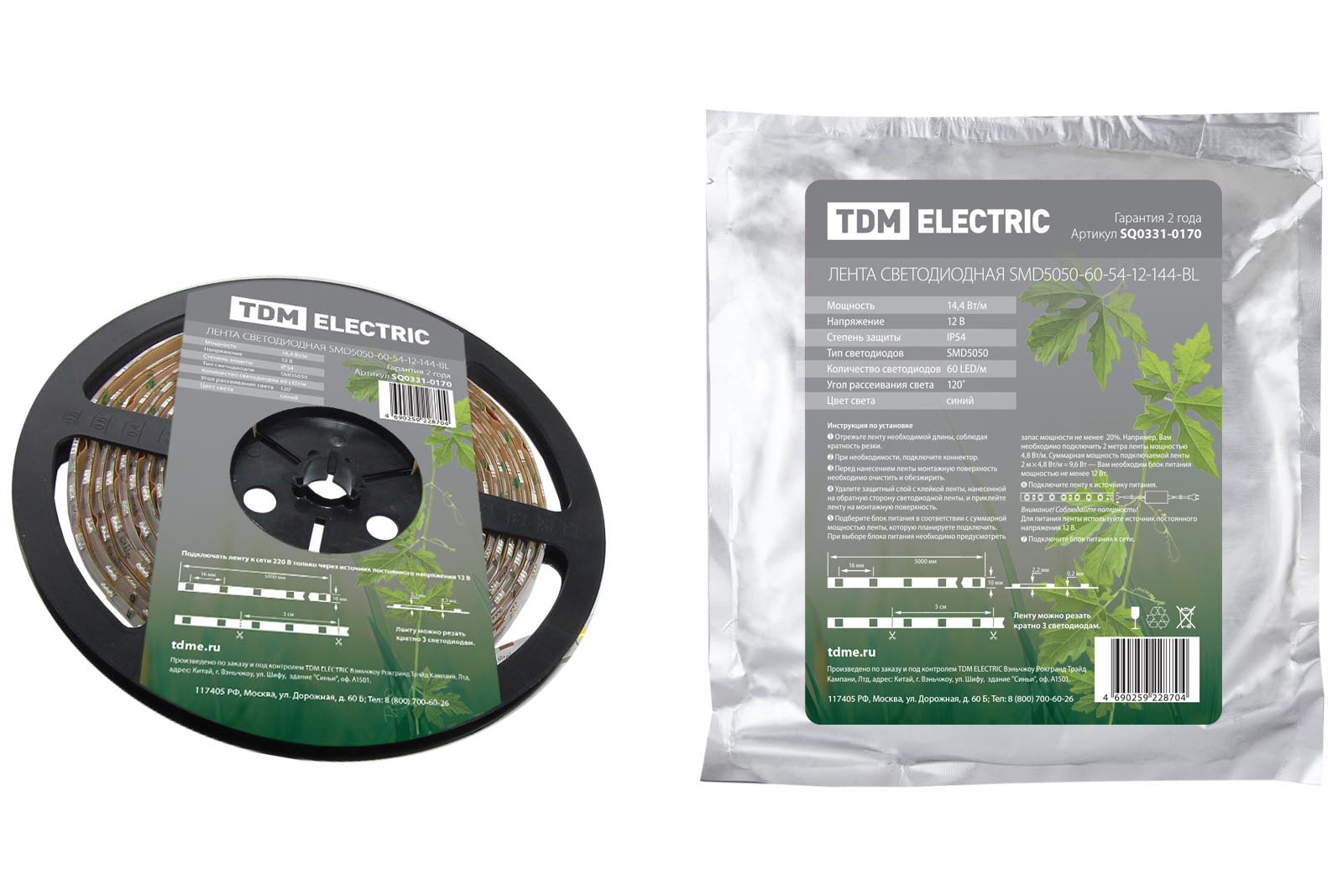 Наименование: Лента светодиодная SMD5050-60-54-12-144-BL 60LED/м, IP54, 12В, 14,4Вт, синий, (У) TDM