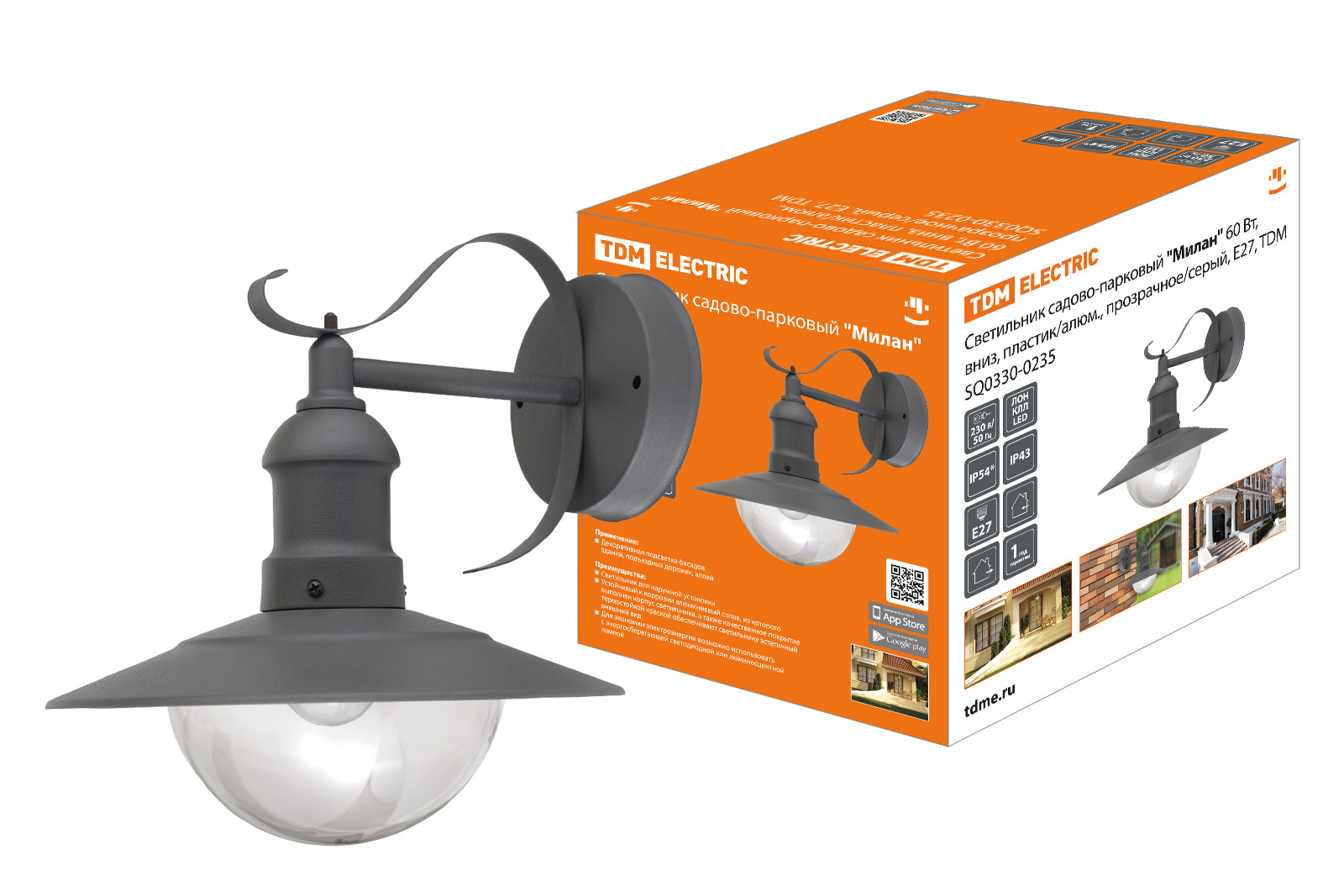 Наименование: Светильник садово-парковый "Милан" 60 Вт, вниз, пластик/алюм., прозрачное/серый, Е27, TDM