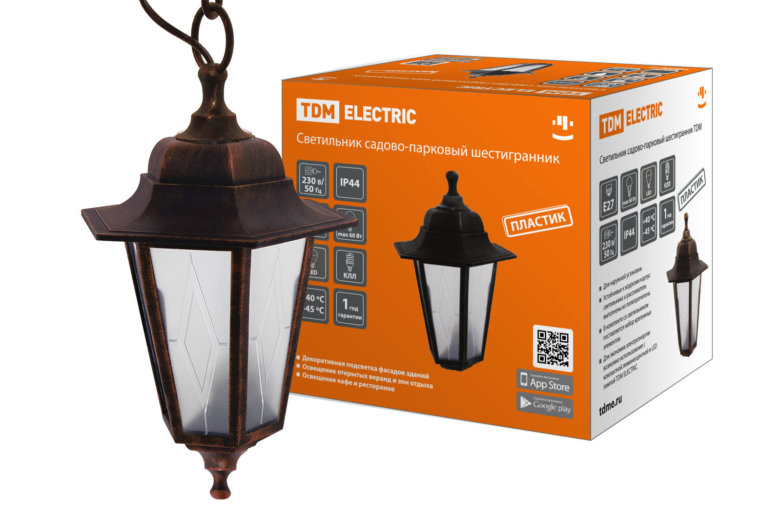 Наименование: Светильник садово-парковый НСУ 06-60-001 шестигр., подвес, пластик, расс.пластик, медь TDM