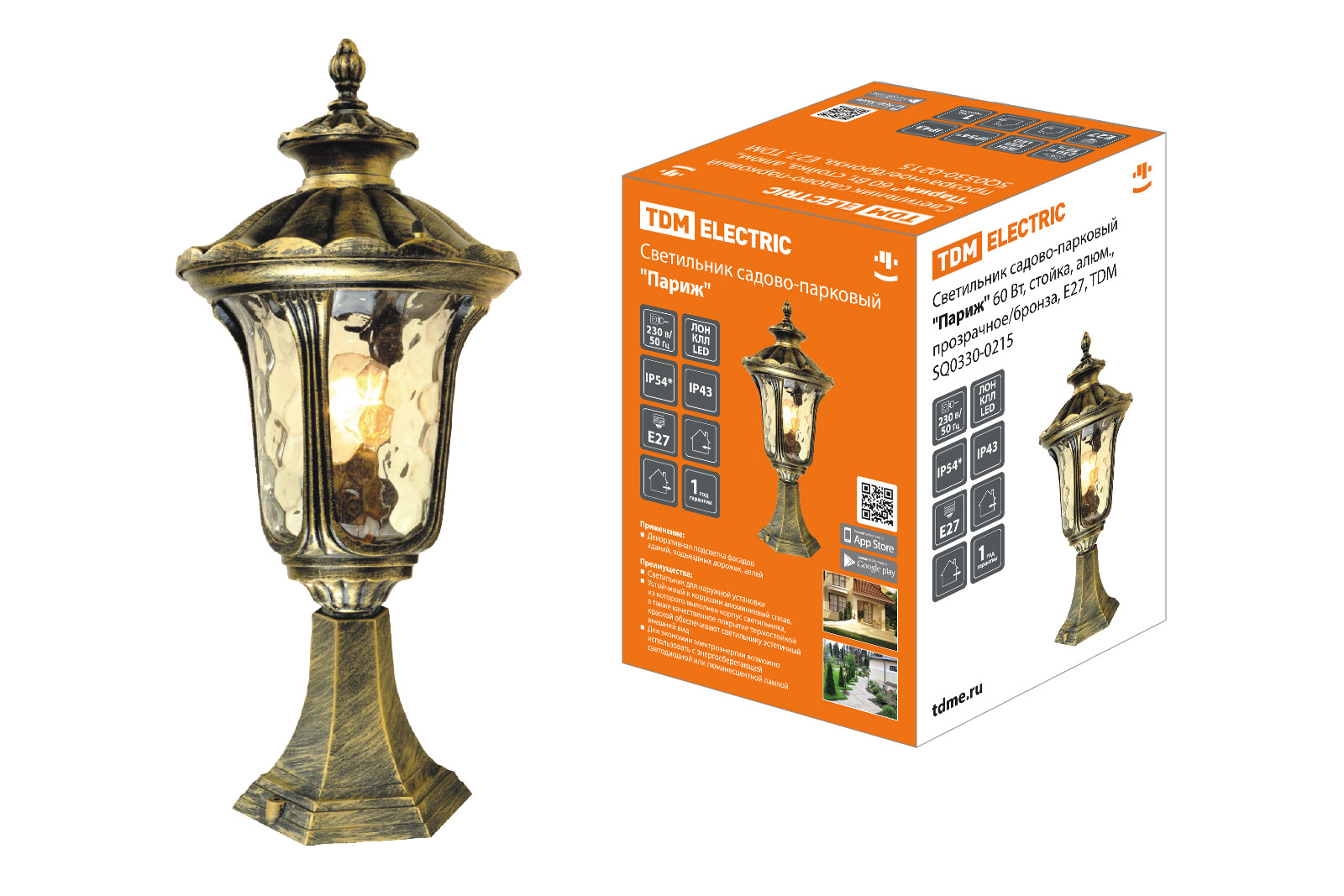 Наименование: Светильник садово-парковый "Париж" 60 Вт, стойка, алюм., прозрачное/бронза, Е27, TDM