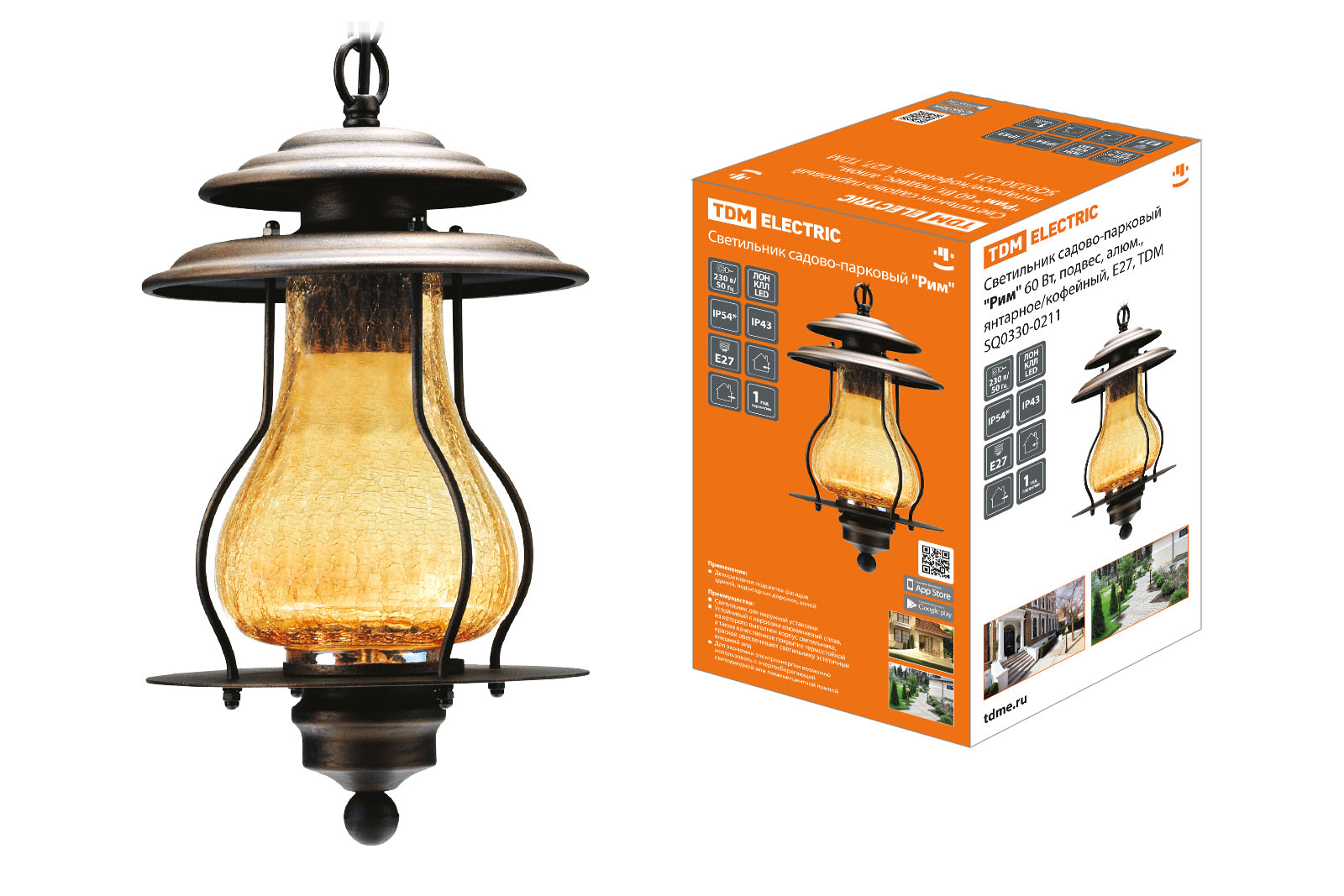 Наименование: Светильник садово-парковый "Рим" 60 Вт, подвес, алюм., янтарное/кофейный, Е27, TDM