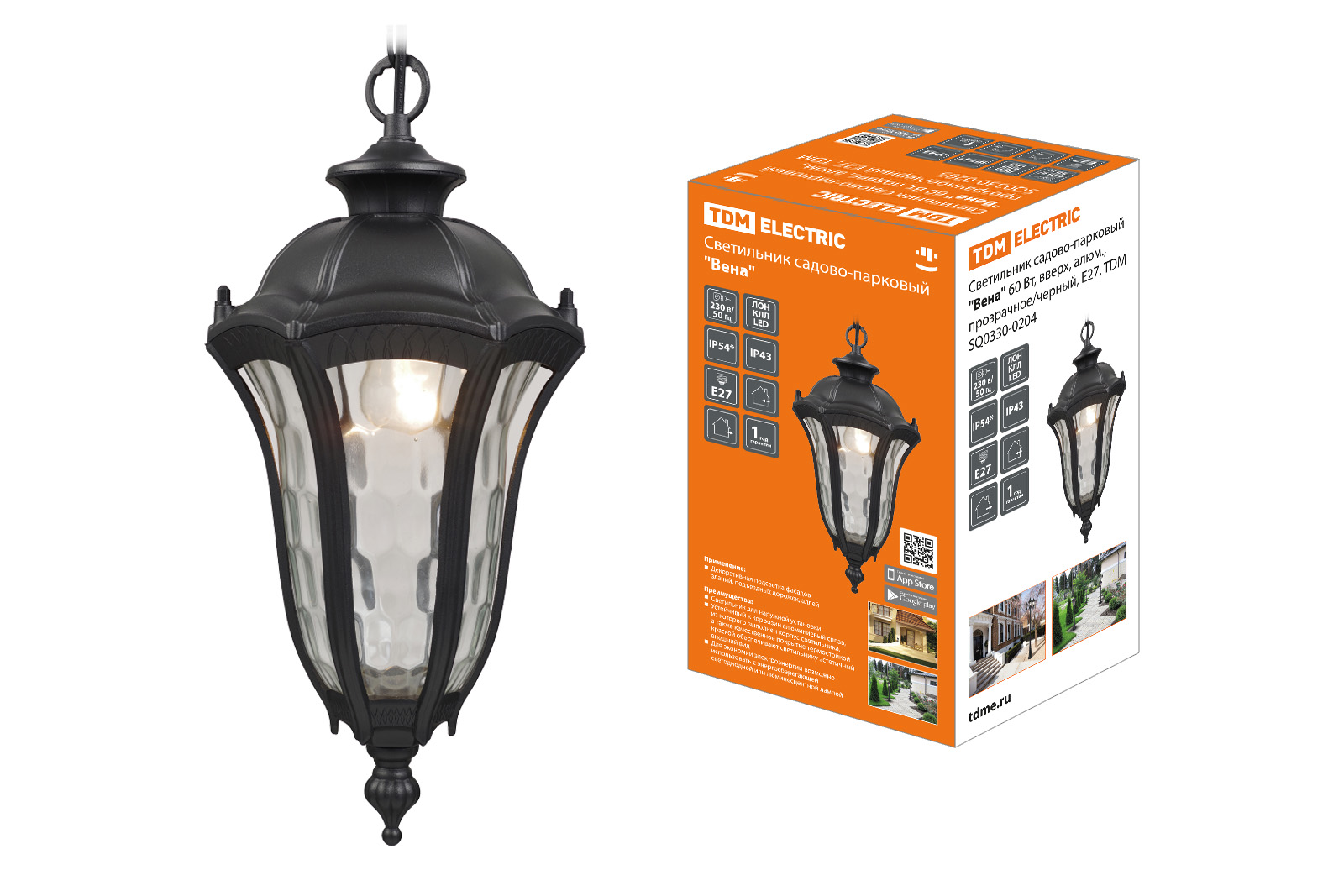 Наименование: Светильник садово-парковый "Вена" 60 Вт, подвес, алюм., прозрачное/черный Е27, TDM