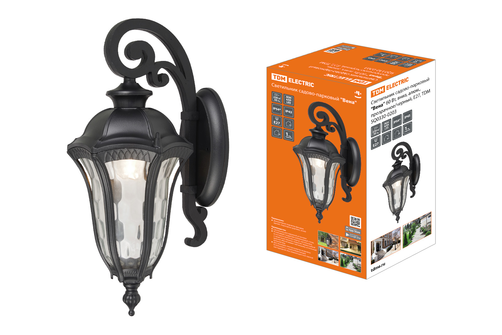 Наименование: Светильник садово-парковый "Вена" 60 Вт, вниз, алюм., прозрачное/черный, Е27, TDM
