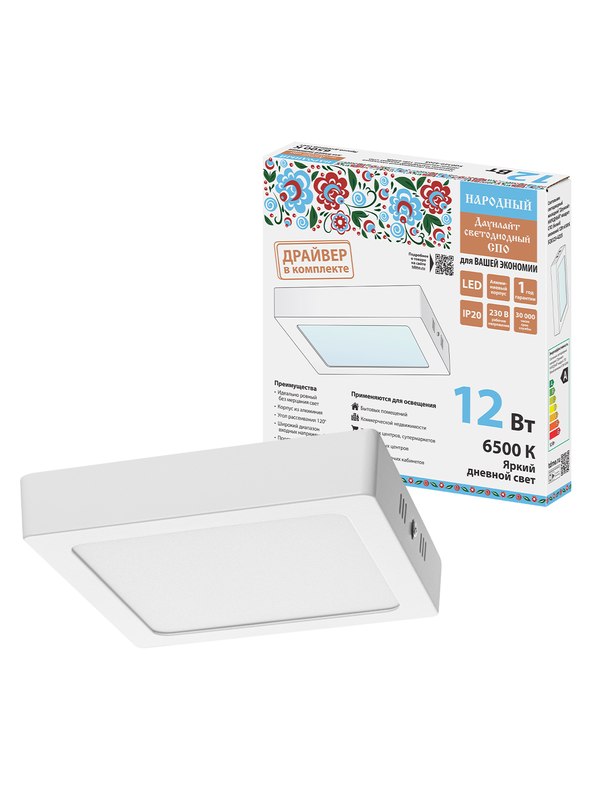 Наименование: Светильник светодиодный накладной "Даунлайт НАРОДНЫЙ" квадрат СПО (белый) алюминий 12Вт 6500К