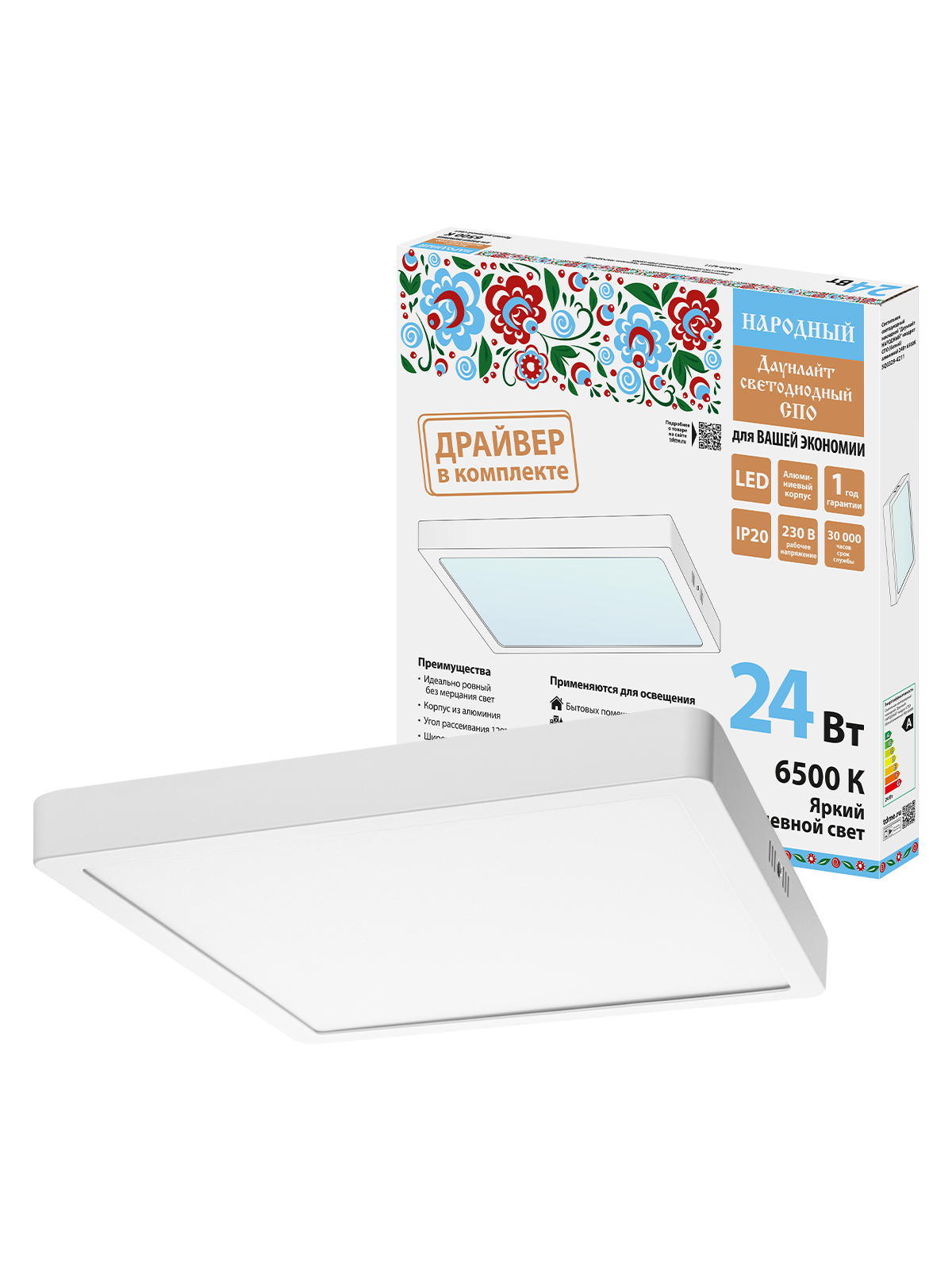 Наименование: Светильник светодиодный накладной "Даунлайт НАРОДНЫЙ" квадрат СПО (белый) алюминий 24Вт 6500К